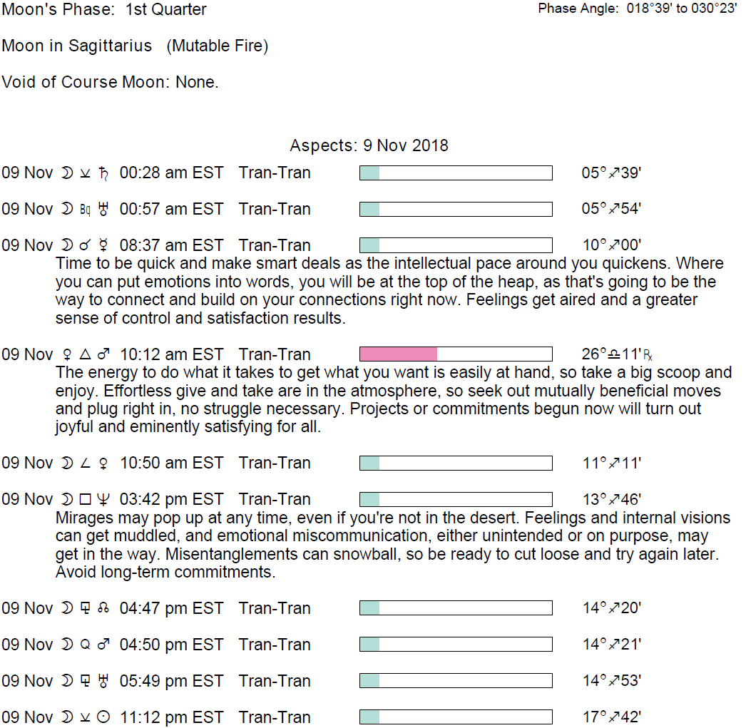 The following aspects (major only) and positions are at noon (EST) on November 9th: