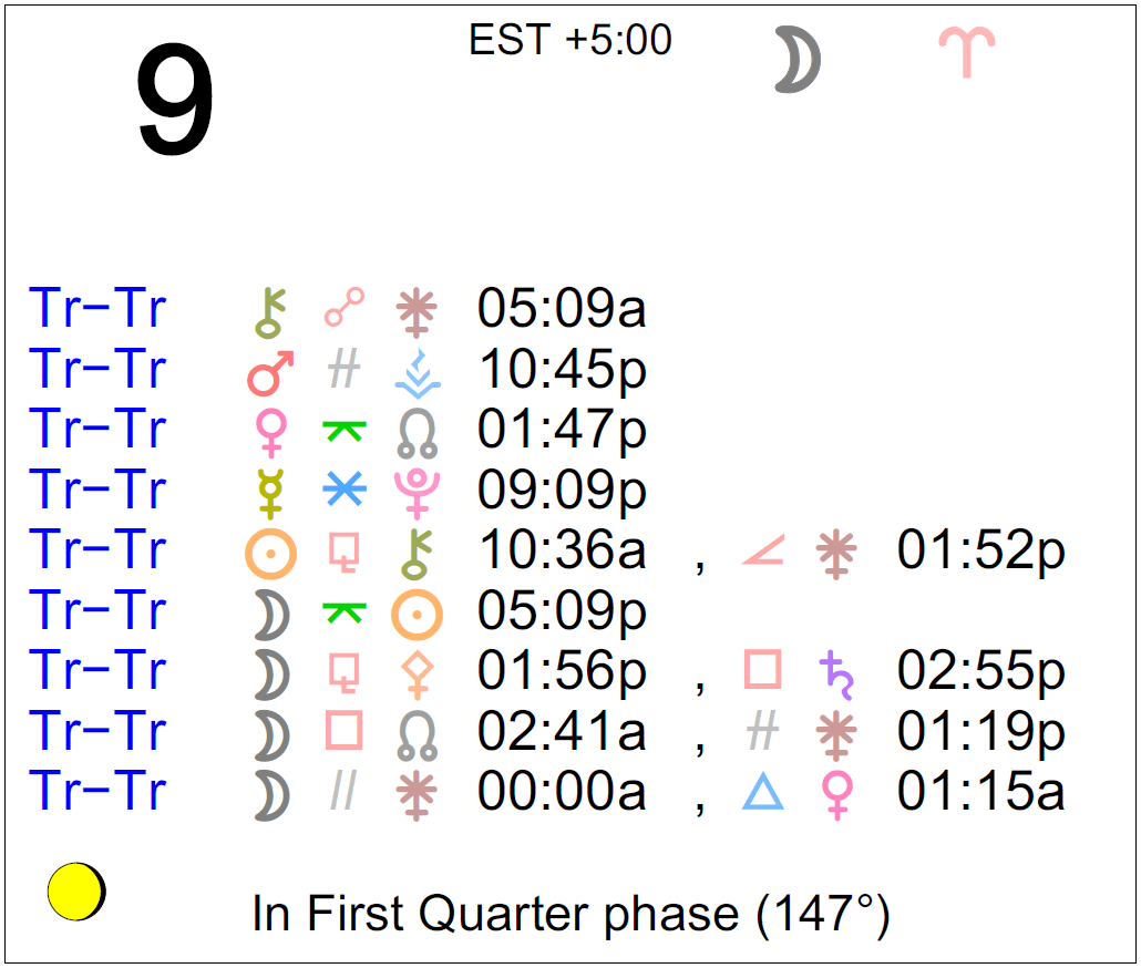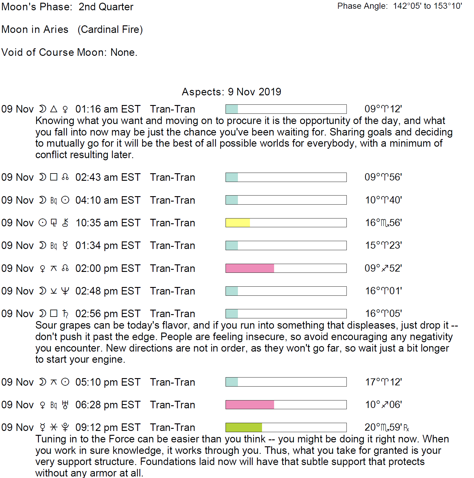 Planet Color Key: The longer the bar, the slower the aspecting planet and the longer the duration of the planet’s transit.