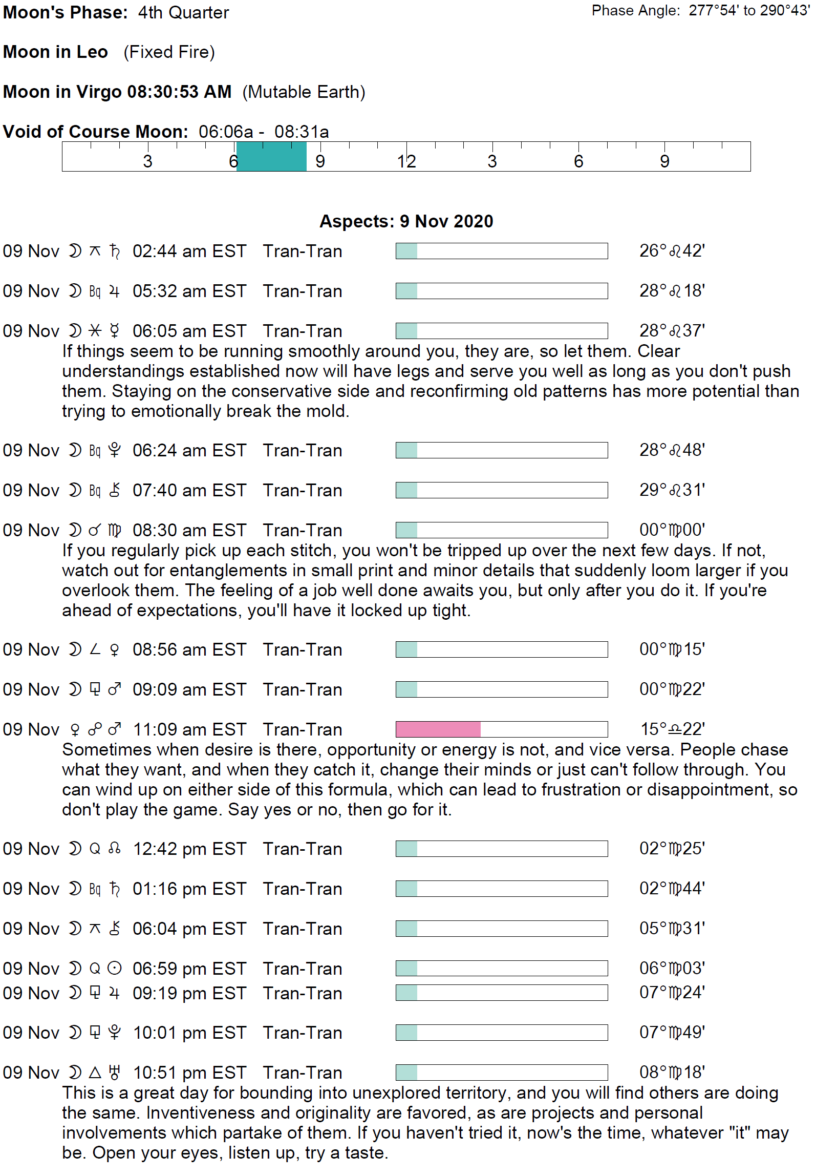 Planet Color Key: The longer the bar, the slower the aspecting planet, and the longer the duration of the planet’s transit.