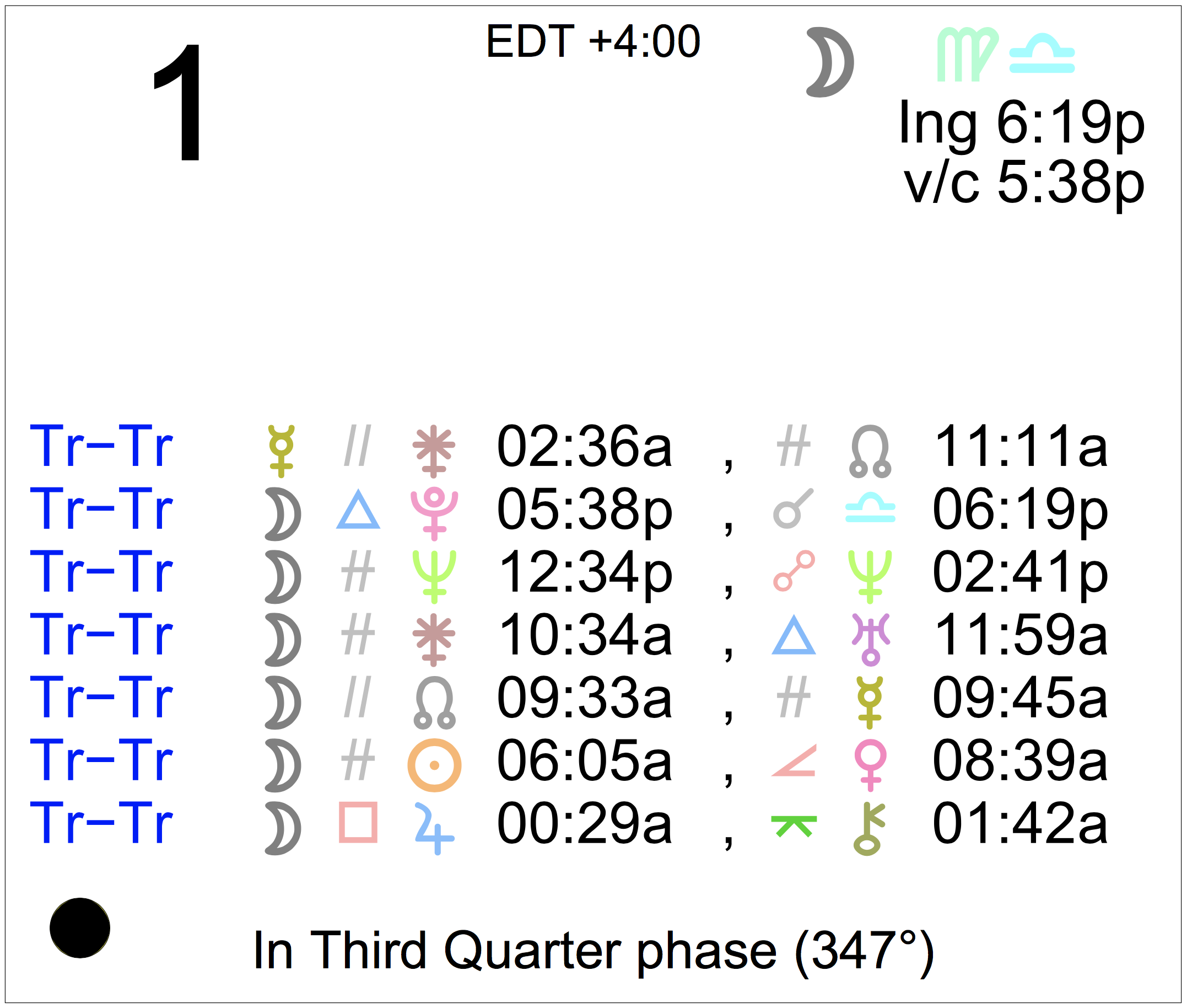 Planet Color Key: The longer the bar, the slower the aspecting planet, and the longer the duration of the planet’s transit.