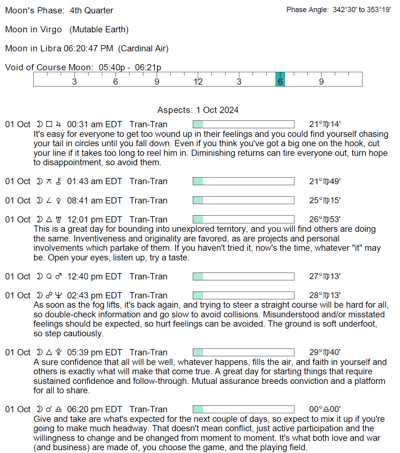 - A void Moon period occurs from 5:38 PM to 6:19 PM today.