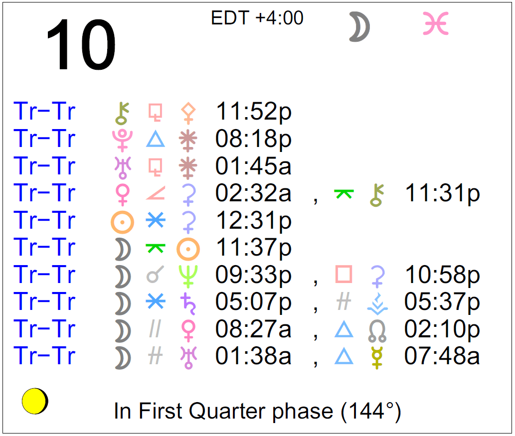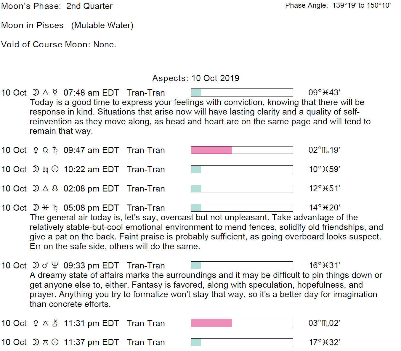 Planet Color Key: The longer the bar, the slower the aspecting planet and the longer the duration of the planet’s transit.