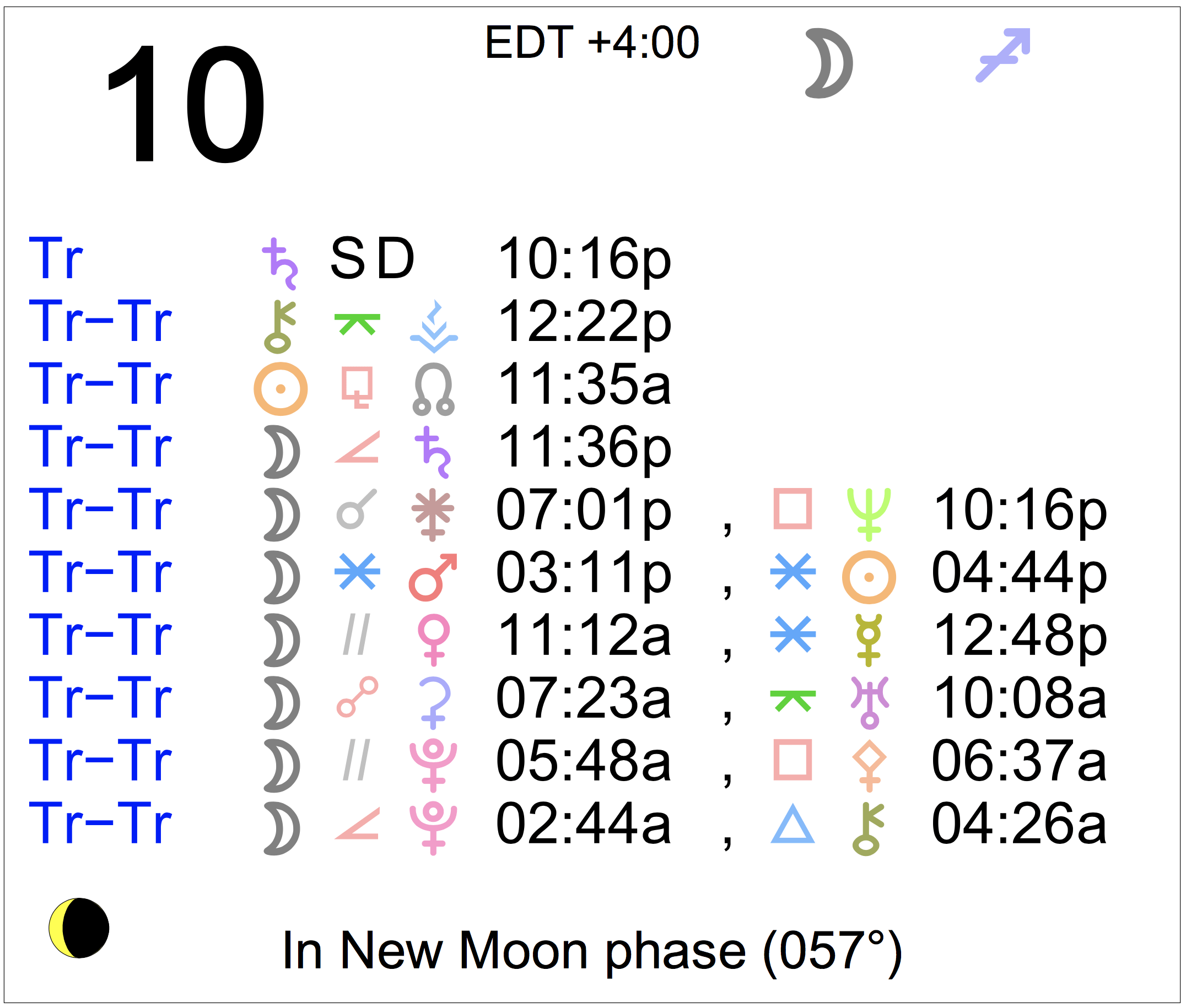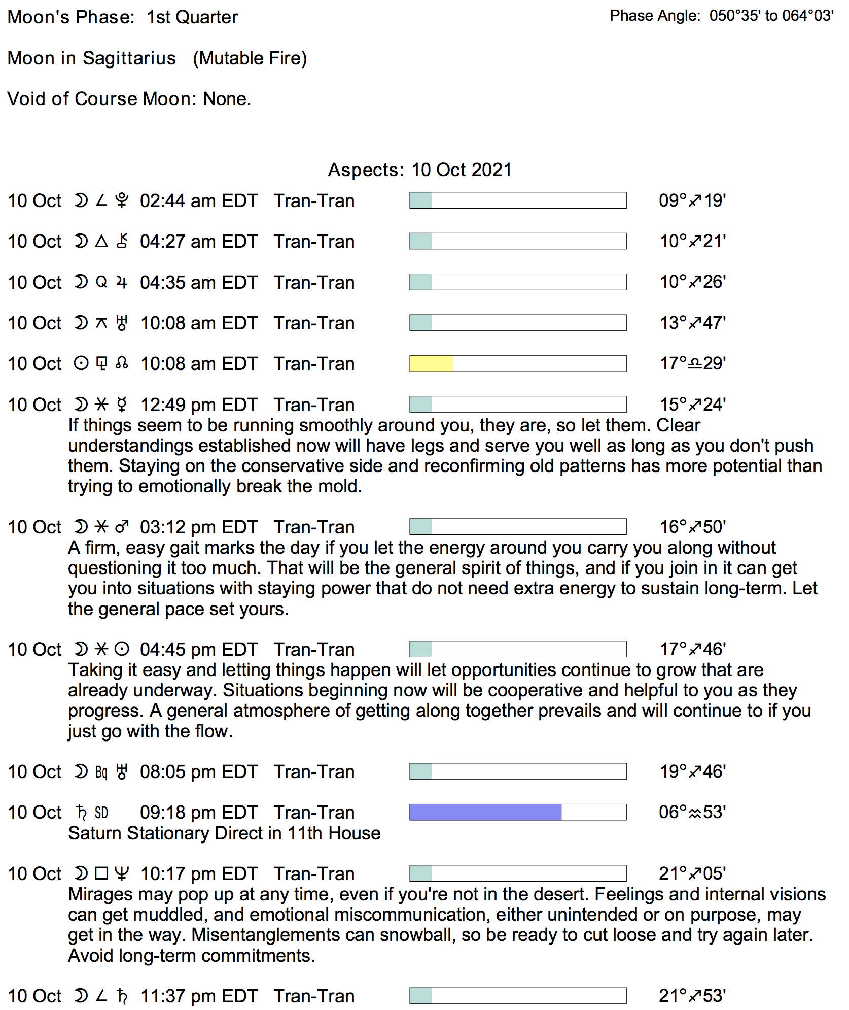 Planet Color Key: The longer the bar, the slower the aspecting planet, and the longer the duration of the planet’s transit.