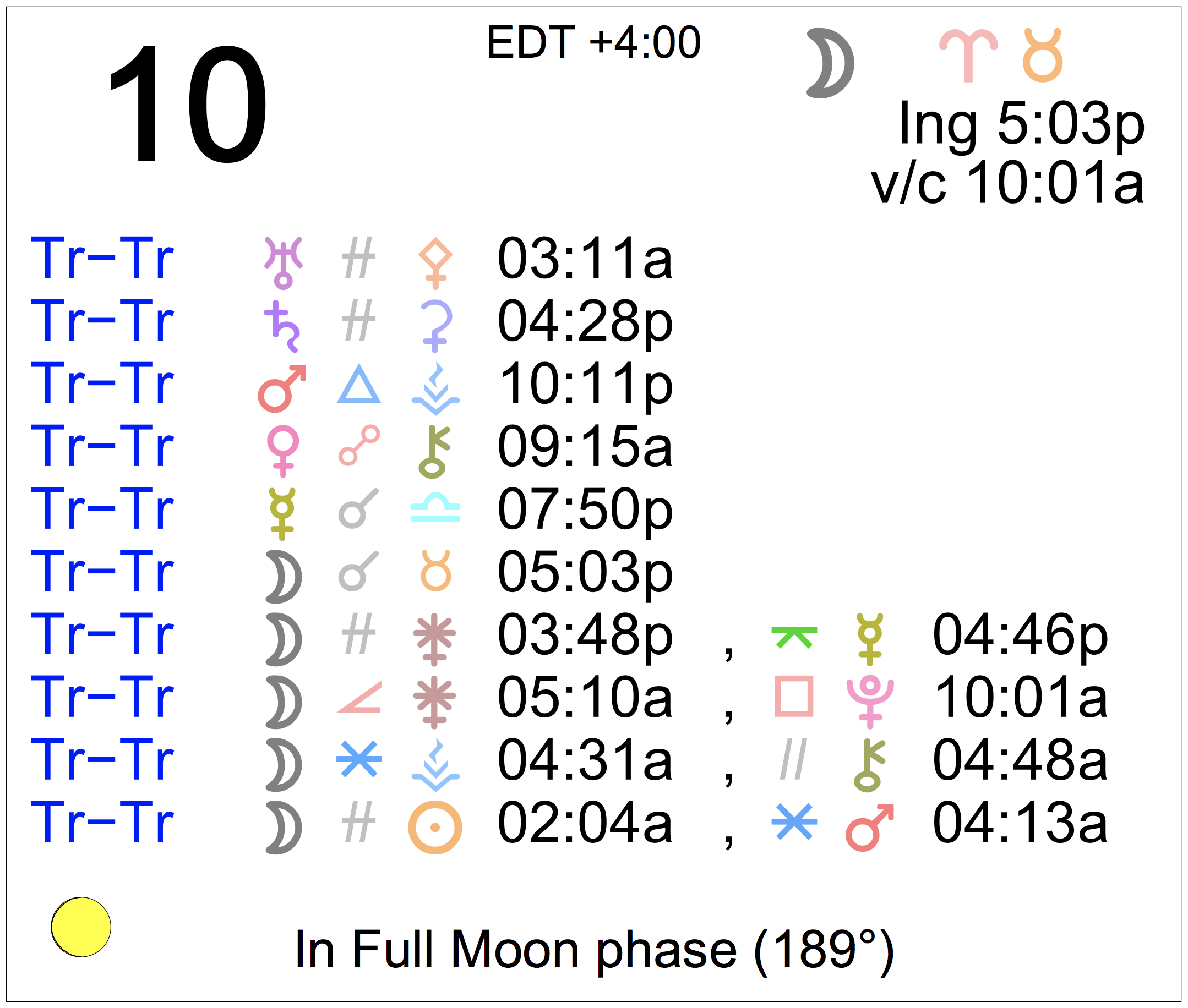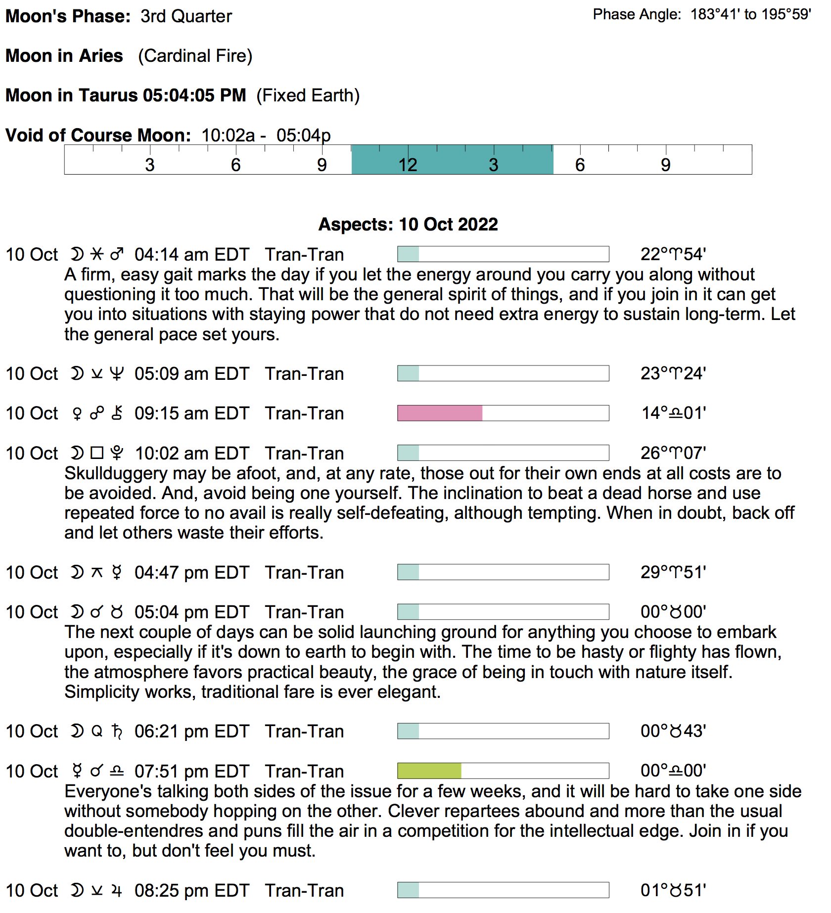 Planet Color Key: The longer the bar, the slower the aspecting planet, and the longer the duration of the planet’s transit.