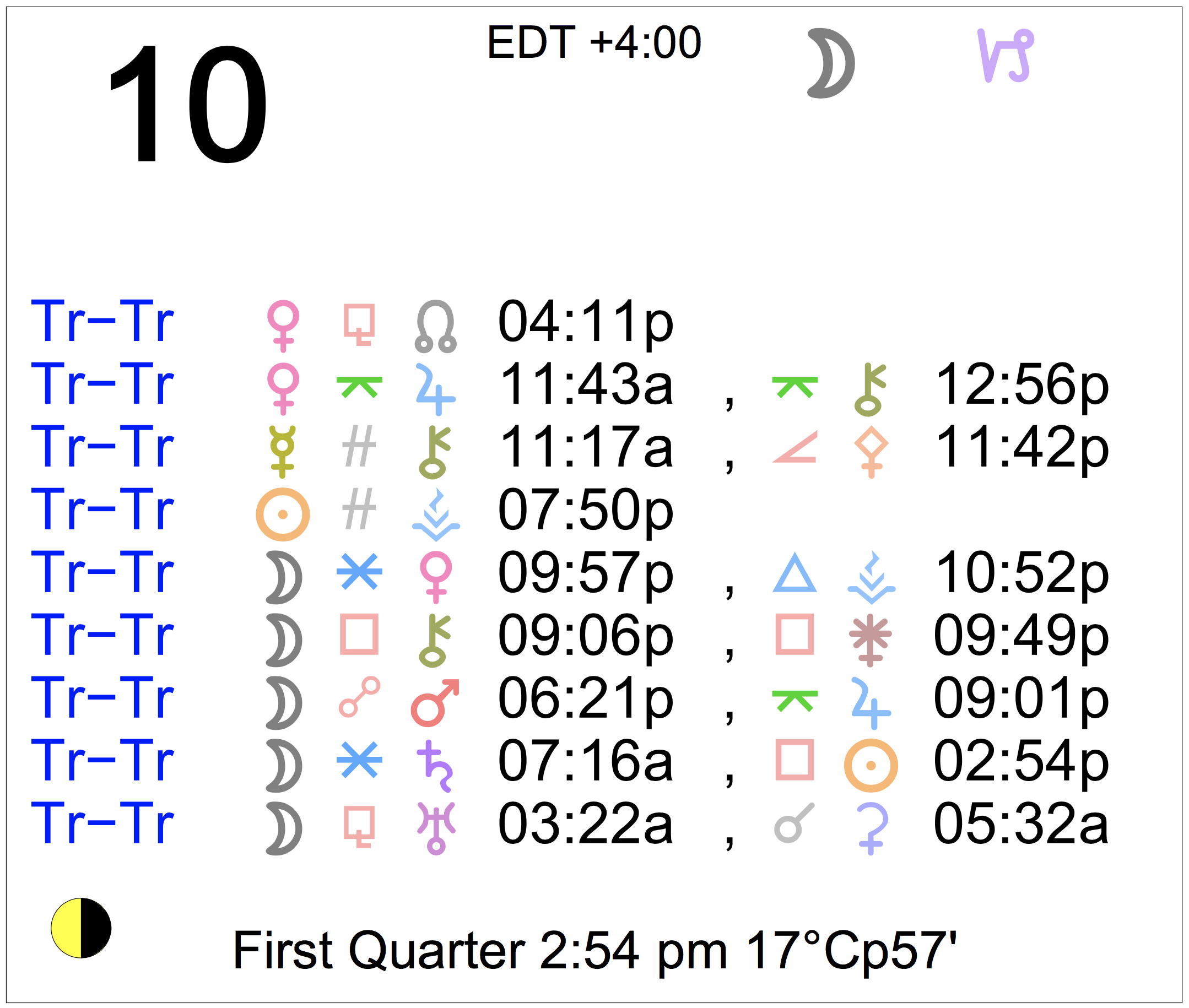 Planet Color Key: The longer the bar, the slower the aspecting planet, and the longer the duration of the planet’s transit.