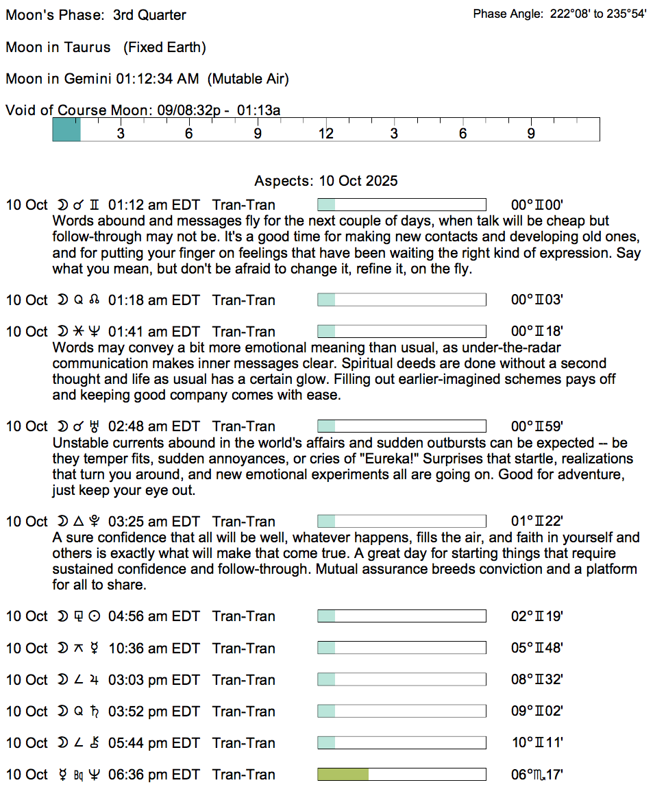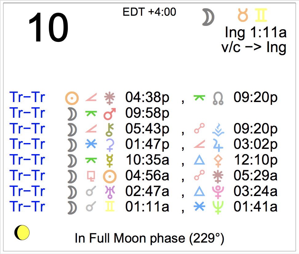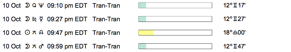 Planet Color Key: The longer the bar, the slower the aspecting planet, and the longer the duration of the planet’s transit.