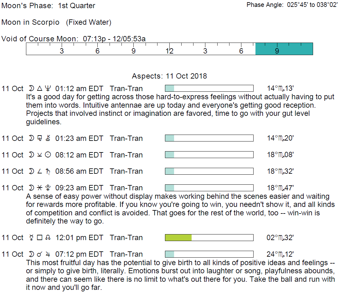 Planet Color Key: The longer the bar, the slower the aspecting planet and the longer the duration of the planet’s transit.
