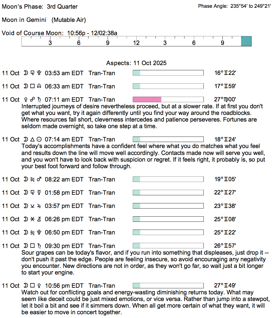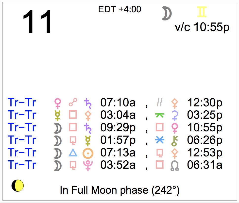 Planet Color Key: The longer the bar, the slower the aspecting planet, and the longer the duration of the planet’s transit.