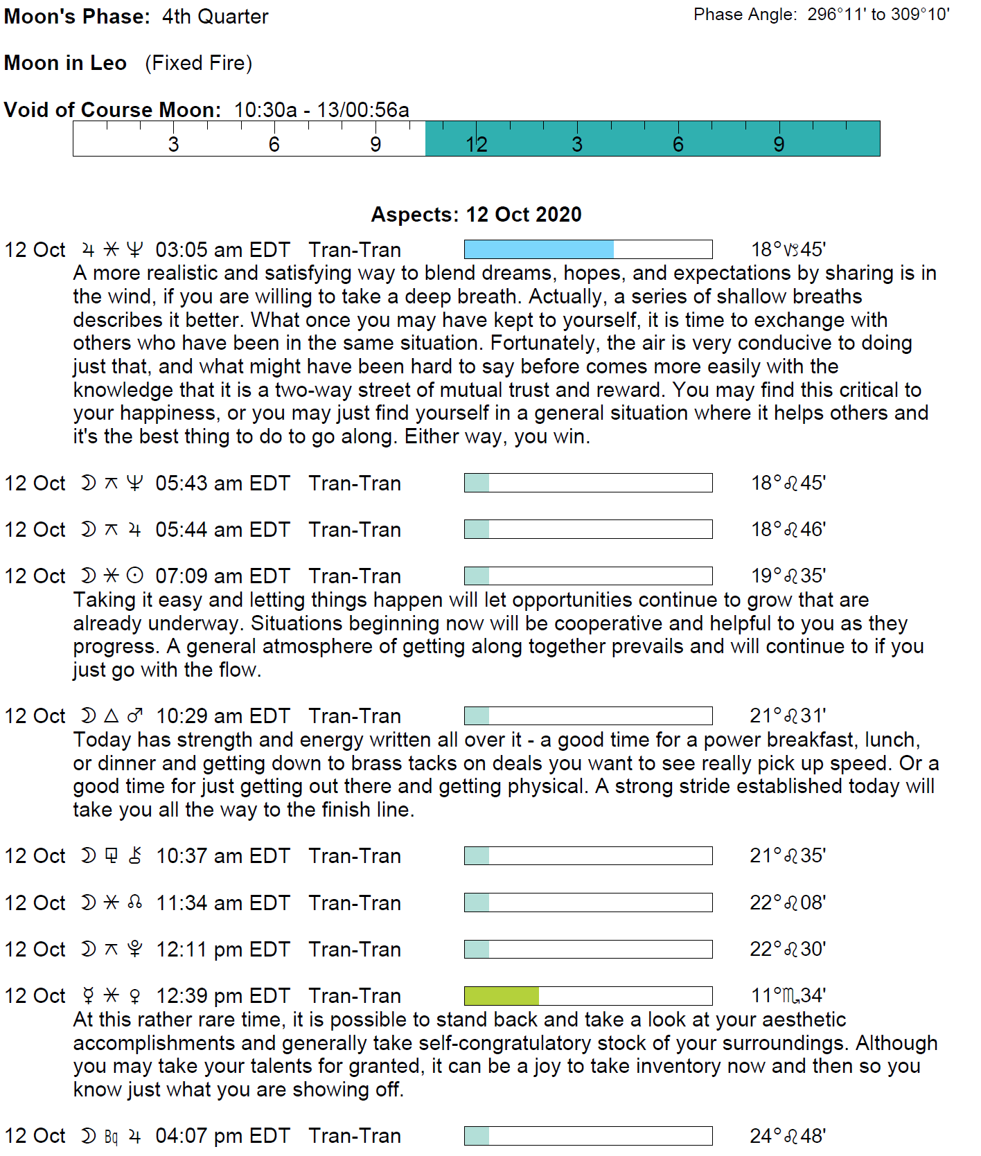 Planet Color Key: The longer the bar, the slower the aspecting planet and the longer the duration of the planet’s transit.