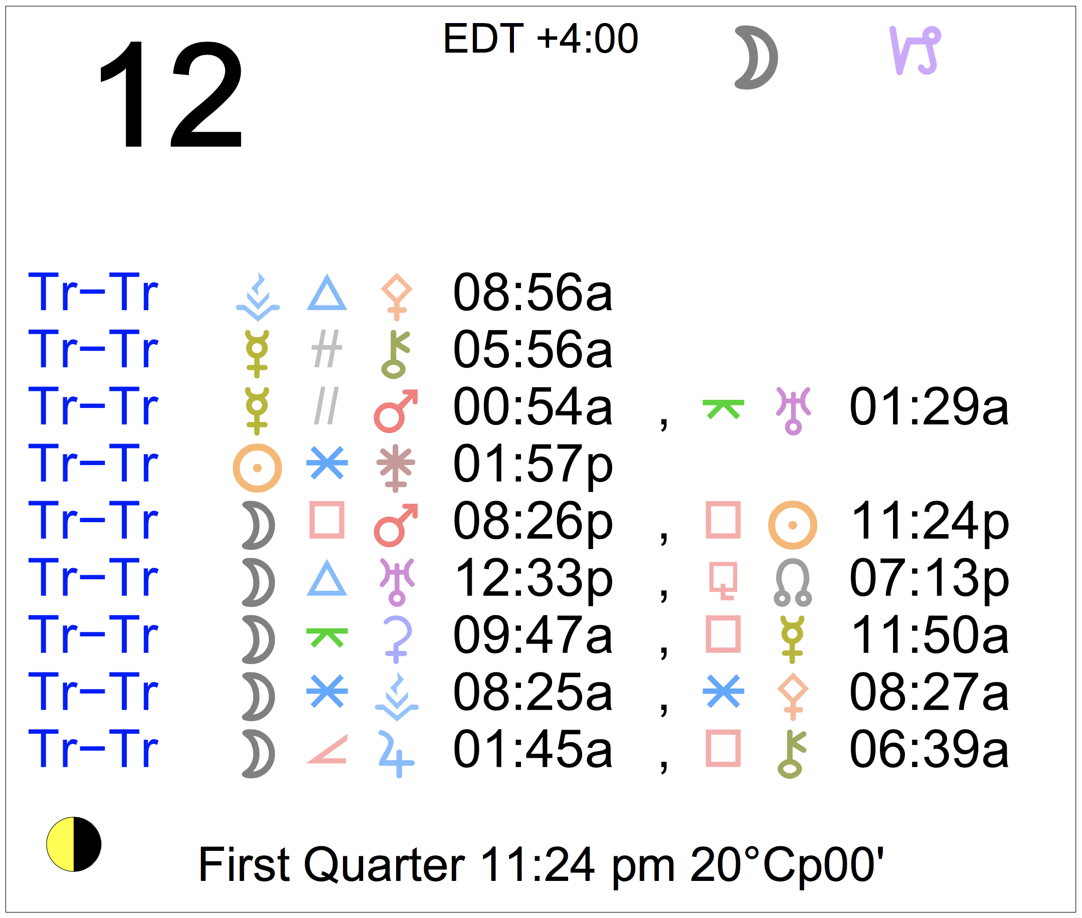 Planet Color Key: The longer the bar, the slower the aspecting planet, and the longer the duration of the planet’s transit.