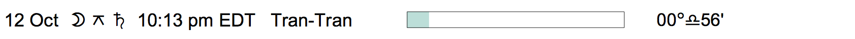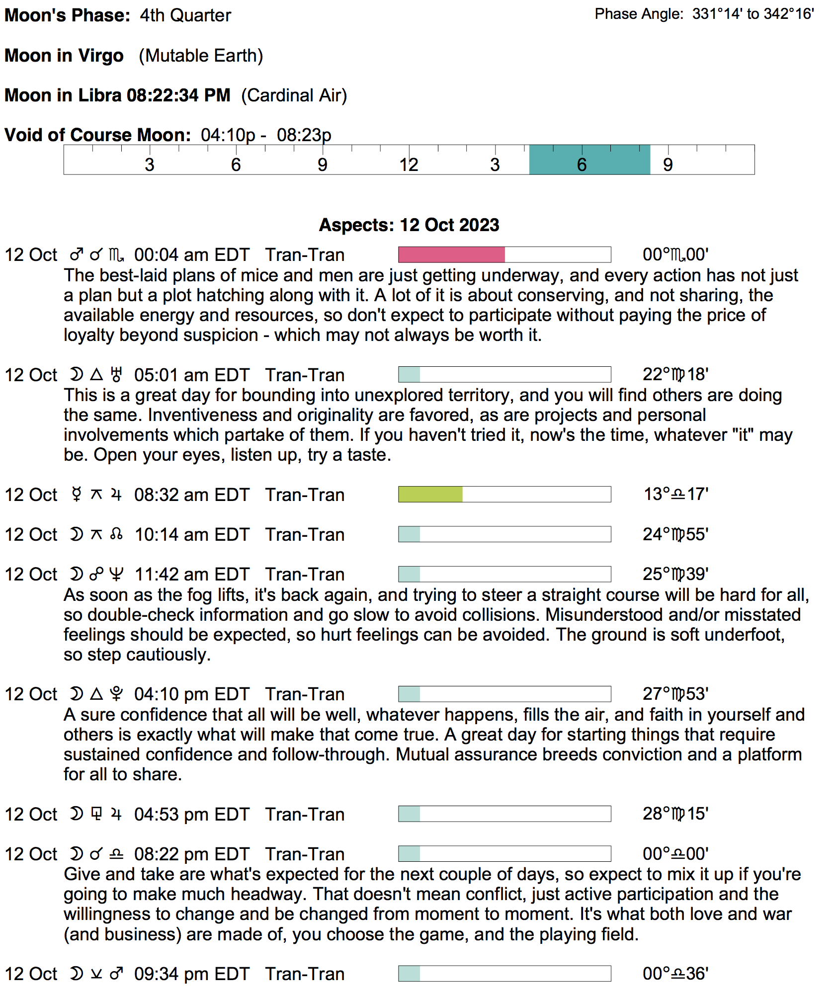 Planet Color Key: The longer the bar, the slower the aspecting planet, and the longer the duration of the planet’s transit.