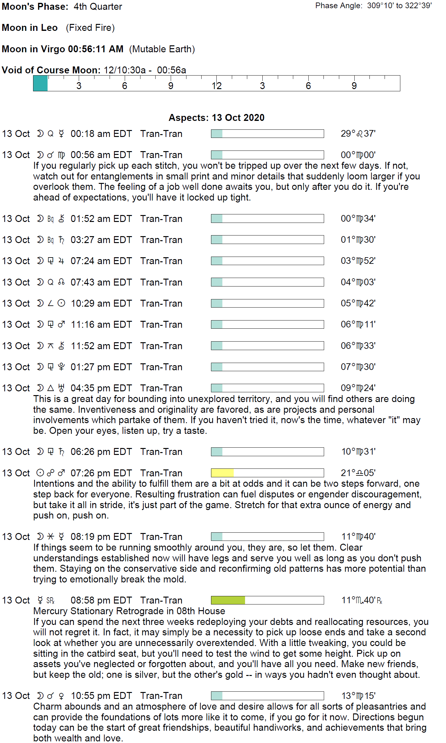 Planet Color Key: The longer the bar, the slower the aspecting planet and the longer the duration of the planet’s transit.