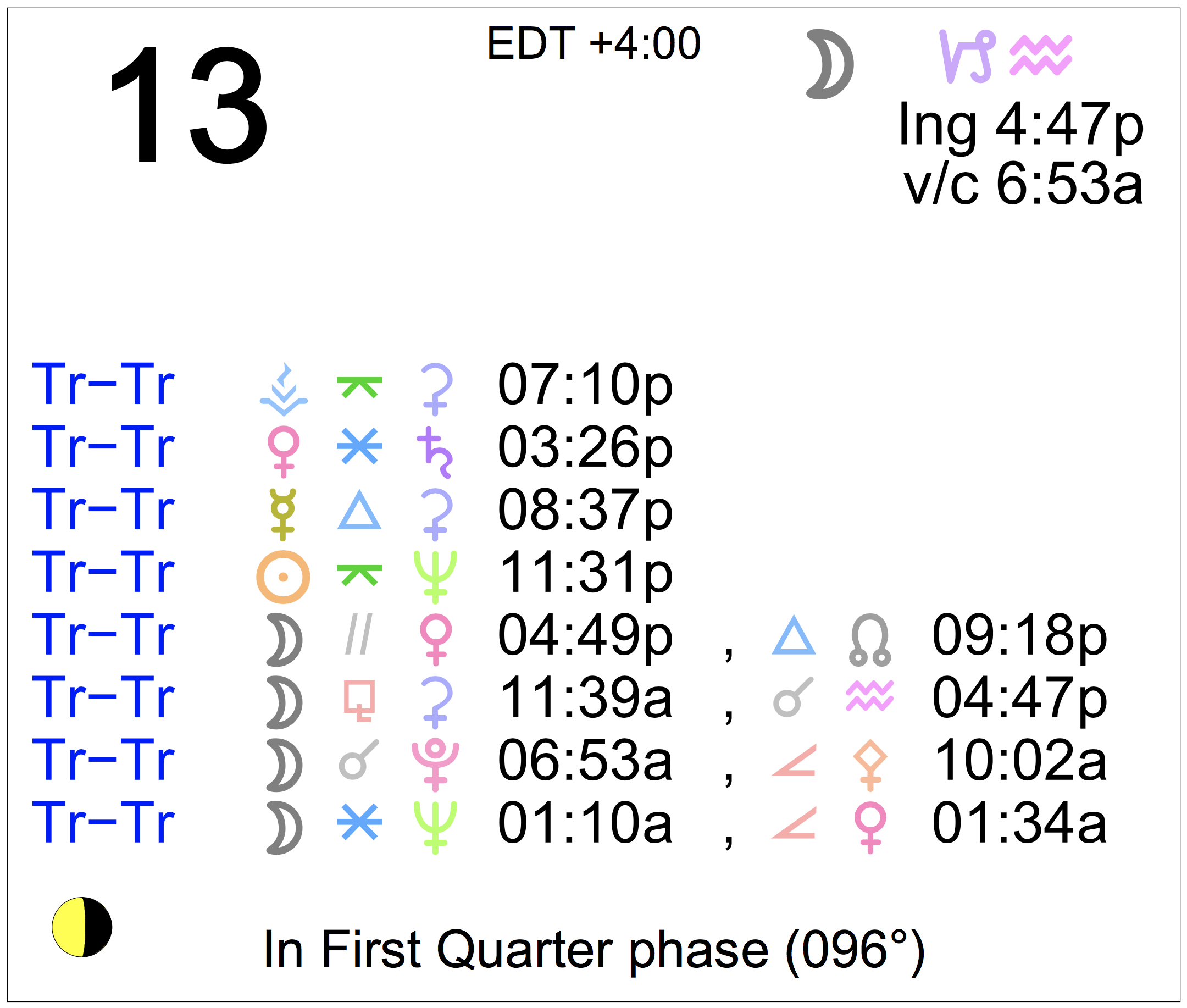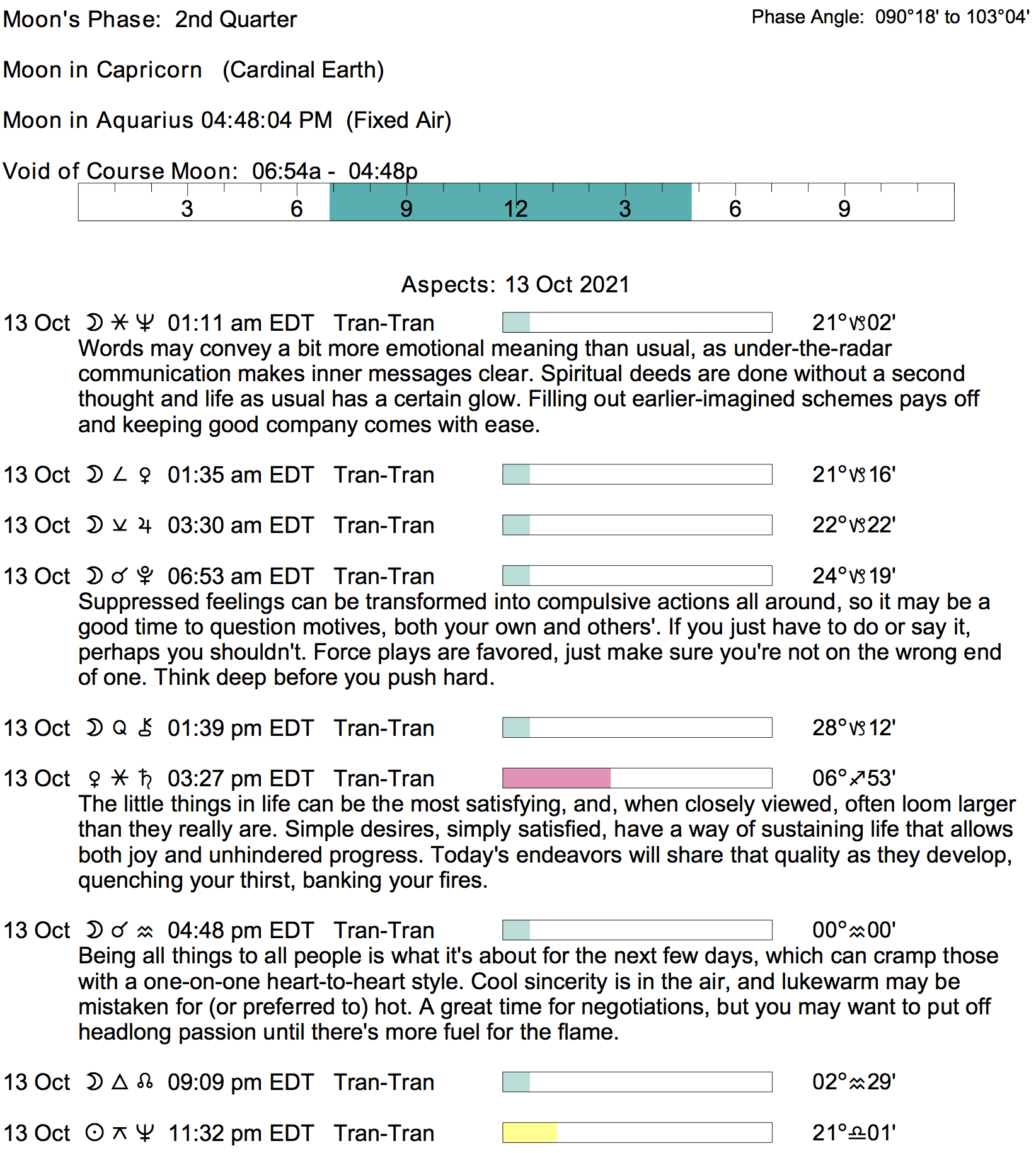 Planet Color Key: The longer the bar, the slower the aspecting planet, and the longer the duration of the planet’s transit.
