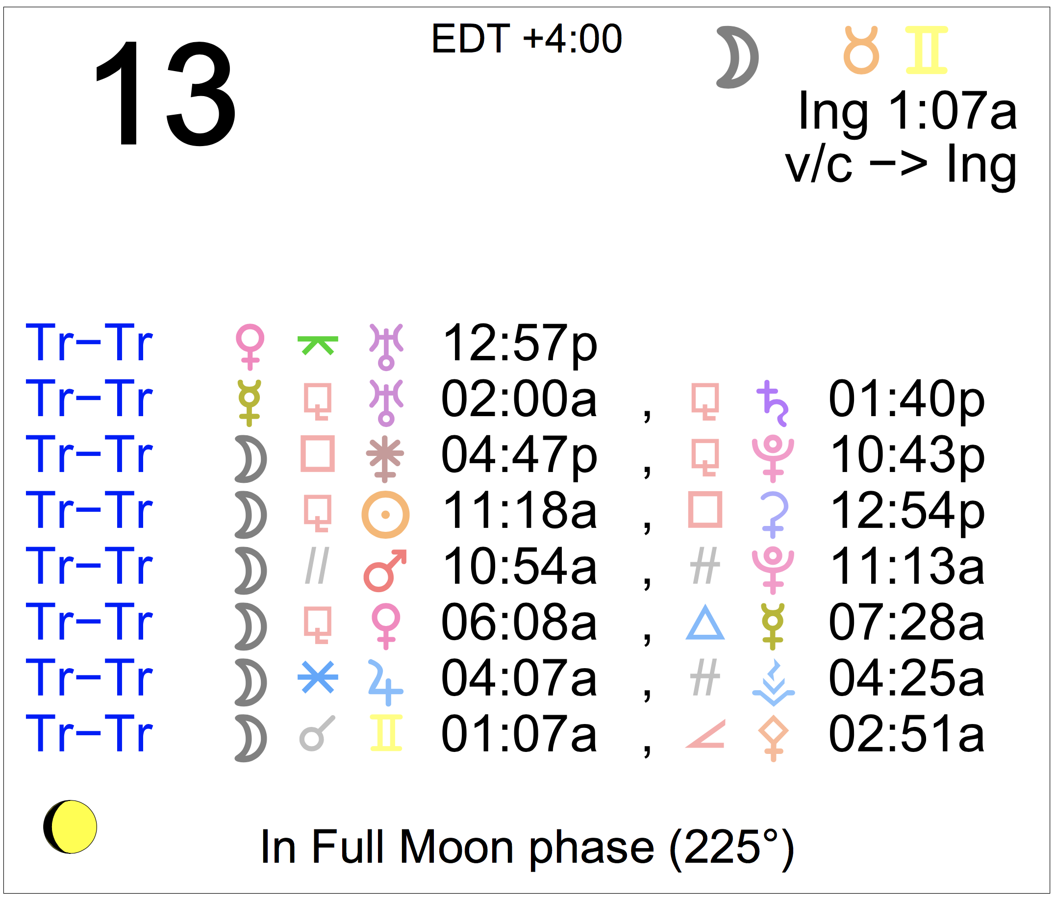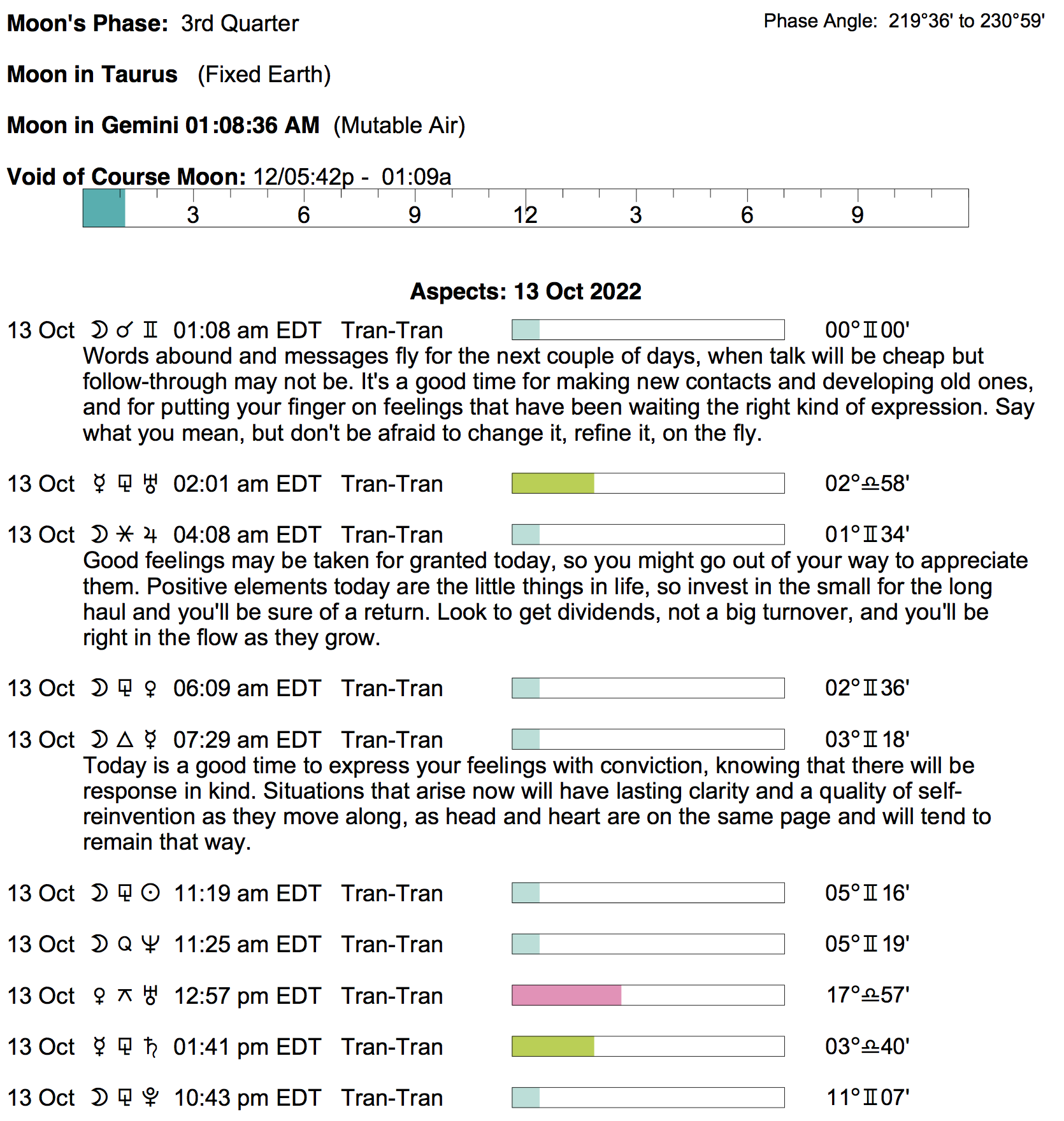 Planet Color Key: The longer the bar, the slower the aspecting planet, and the longer the duration of the planet’s transit.