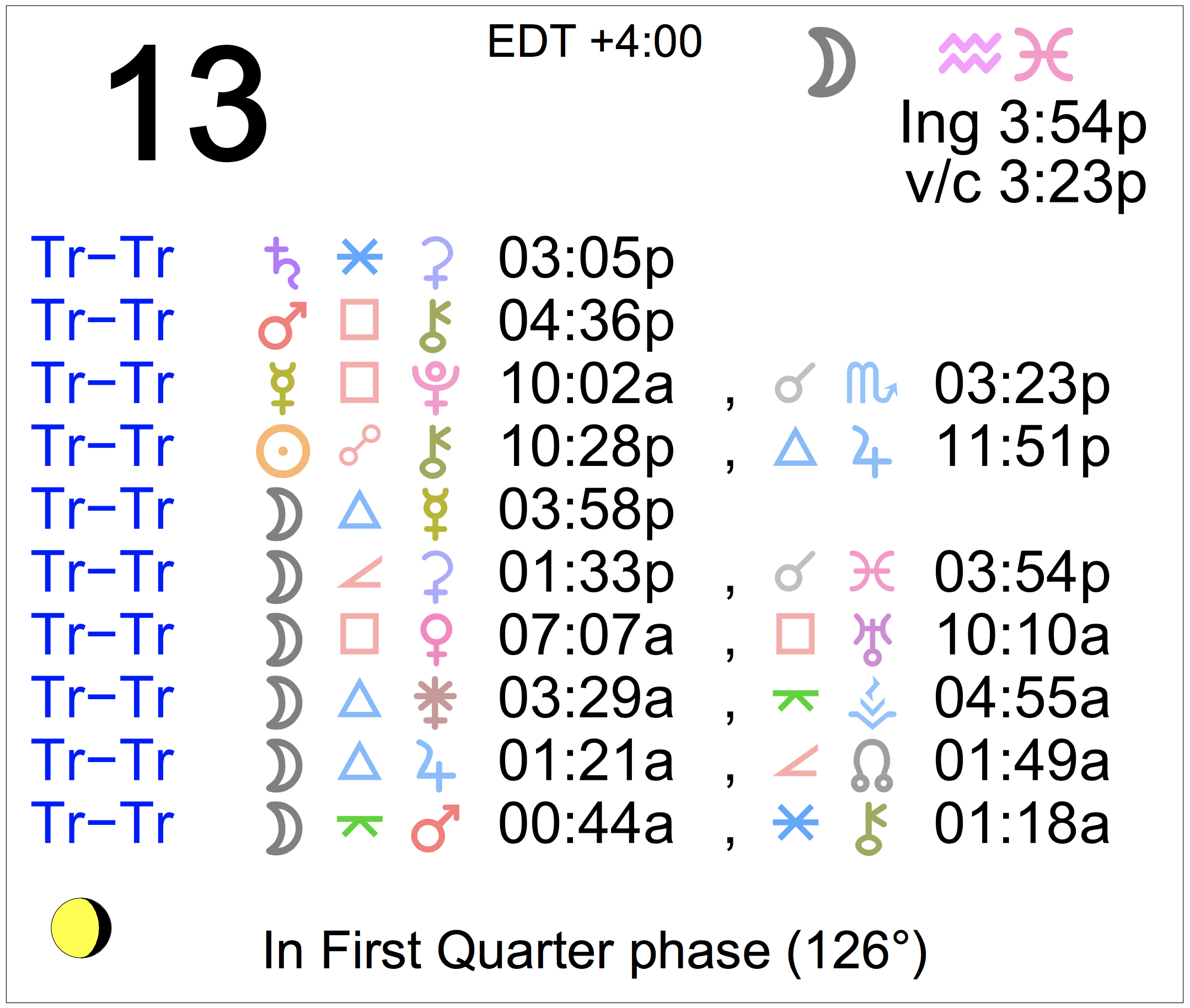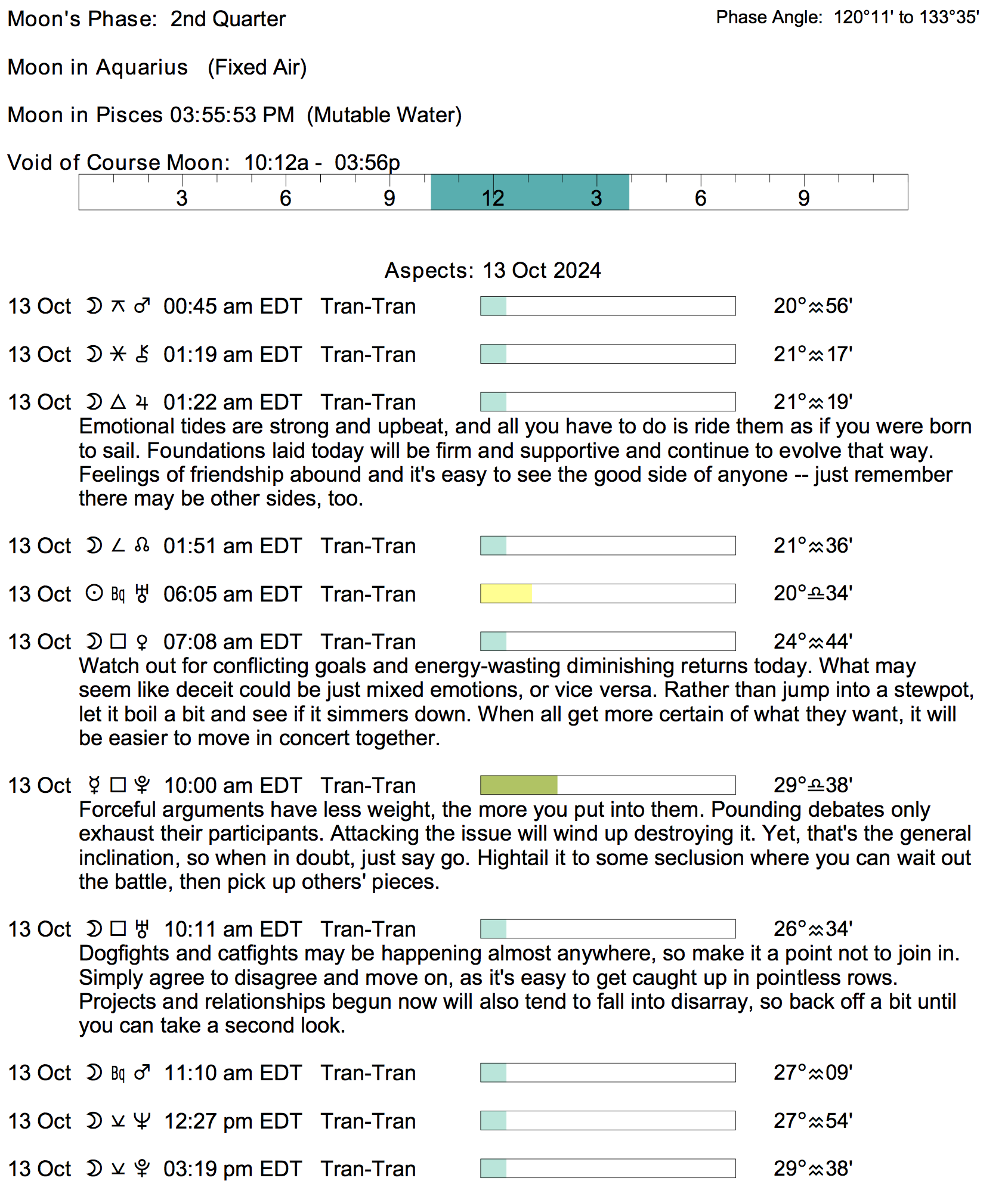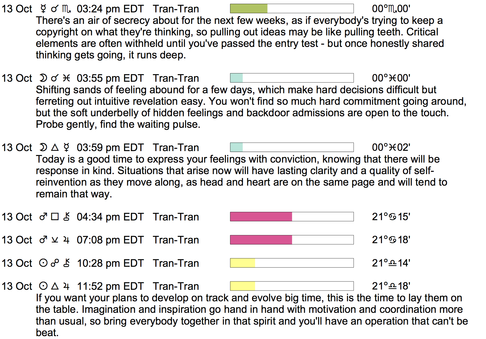 Planet Color Key: The longer the bar, the slower the aspecting planet, and the longer the duration of the planet’s transit.