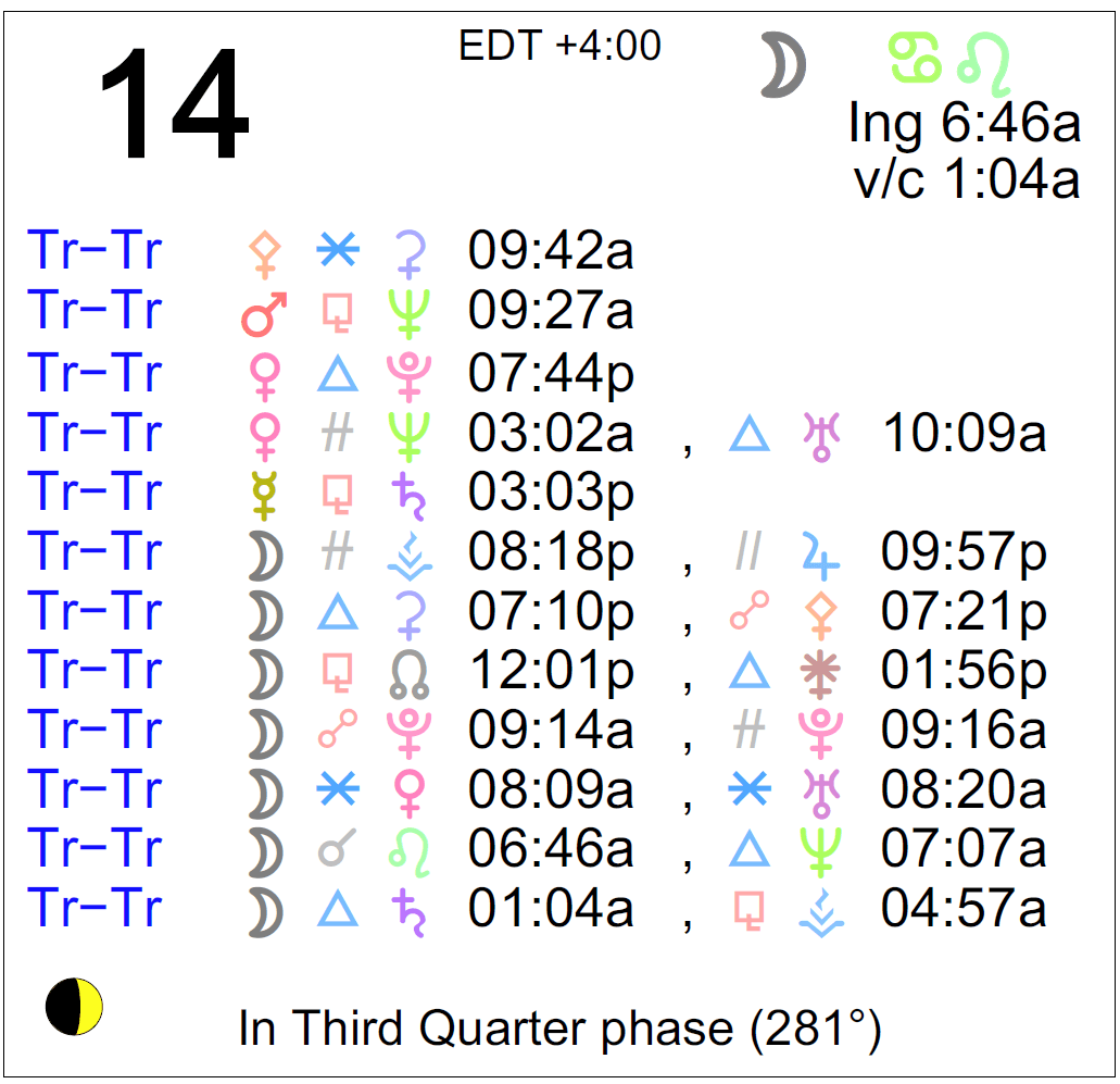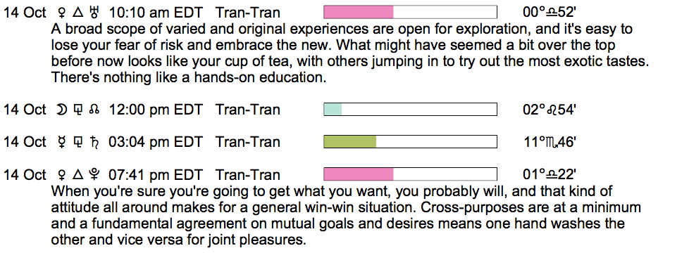 Planet Color Key: The longer the bar, the slower the aspecting planet, and the longer the duration of the planet’s transit.