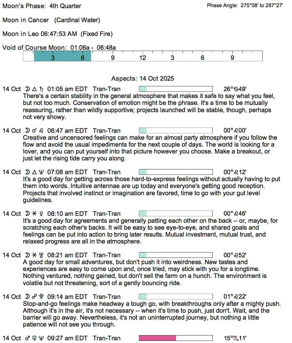 - A void Moon period occurs from 1:04 AM to 6:46 AM today.