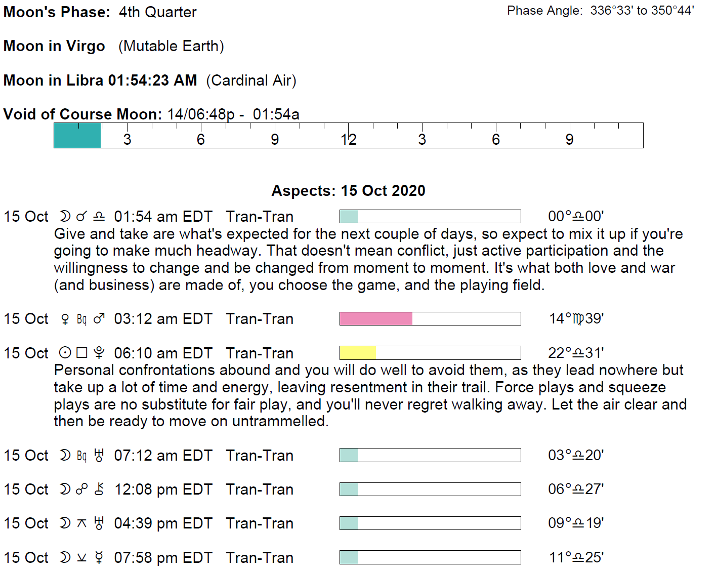 Planet Color Key: The longer the bar, the slower the aspecting planet and the longer the duration of the planet’s transit.