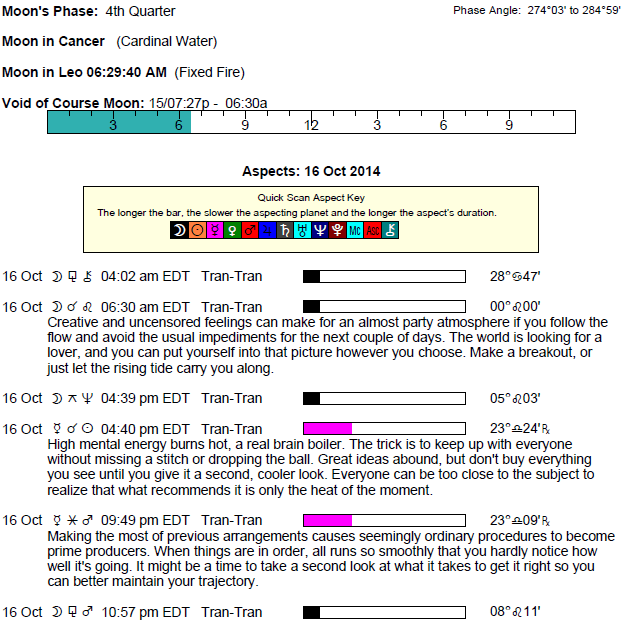 Note that the Moon moves at a rate of approximately one degree every 2 hours, so that if an aspect involving is applying and has an orb of 5 degrees, the aspect will perfect (be exact) in about 10 hours. If the Moon is separating from an aspect with an orb of 2 degrees, it has already formed said aspect approximately 4 hours ago (since the following are positions at noon today, then it would have occurred at about 8 AM today).