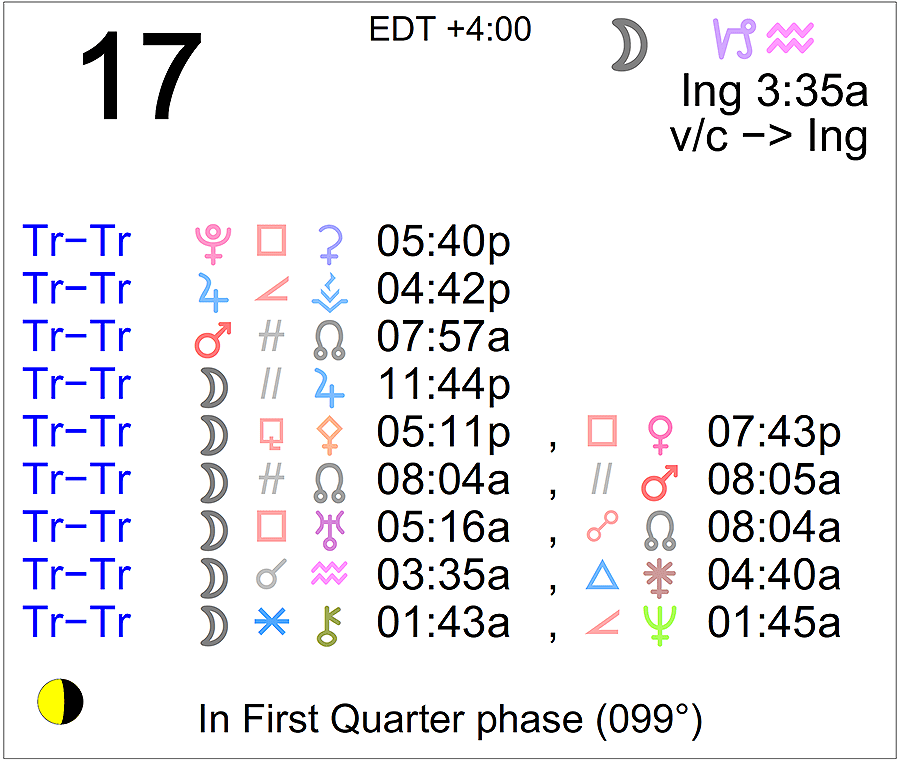 Planet Color Key: The longer the bar, the slower the aspecting planet and the longer the duration of the planet’s transit.