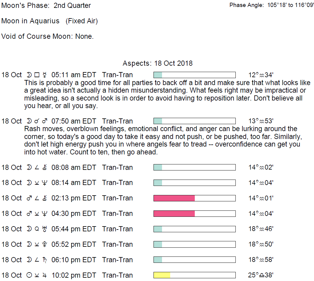 Planet Color Key: The longer the bar, the slower the aspecting planet and the longer the duration of the planet’s transit.