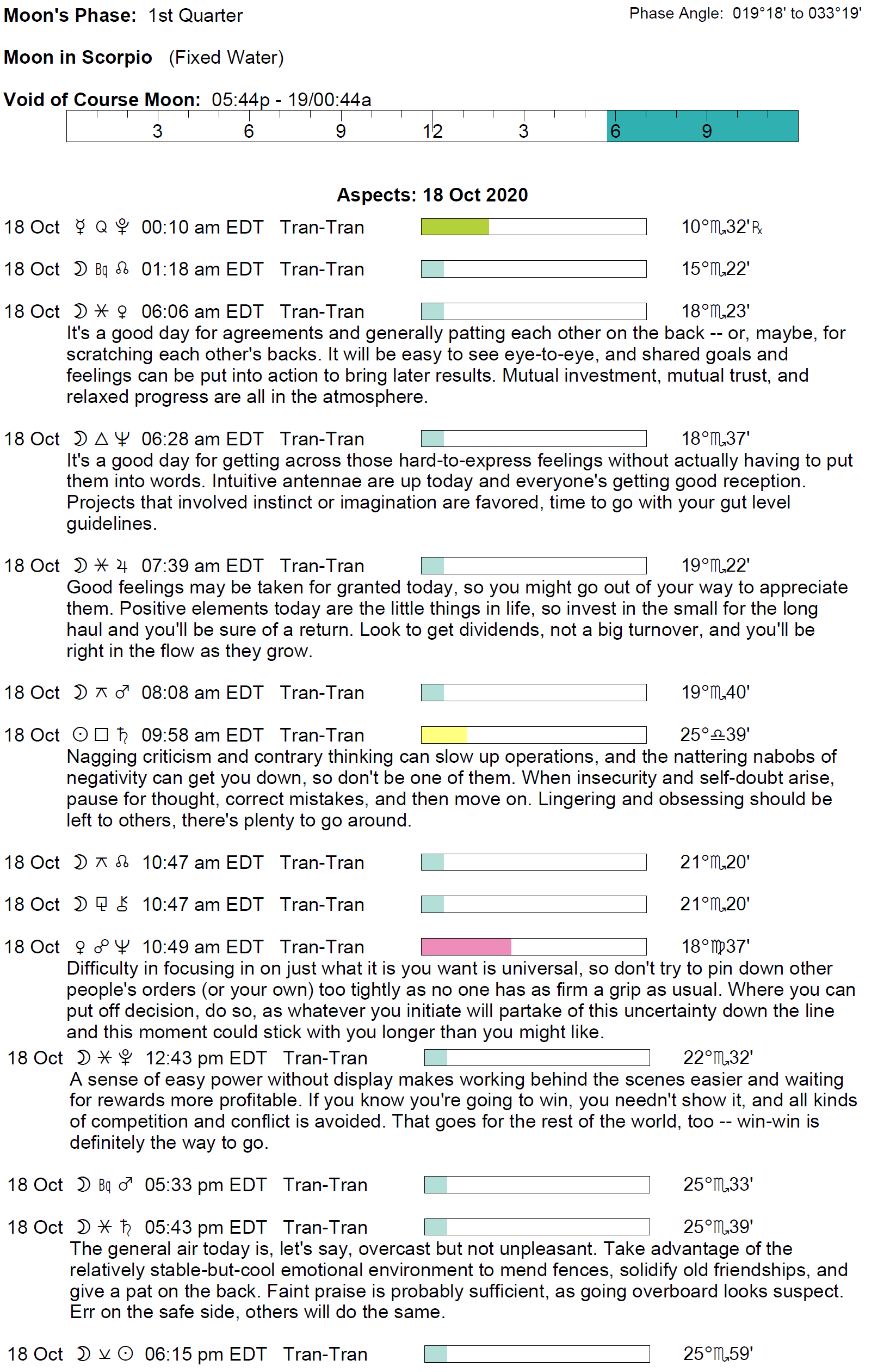 Planet Color Key: The longer the bar, the slower the aspecting planet, and the longer the duration of the planet’s transit.
