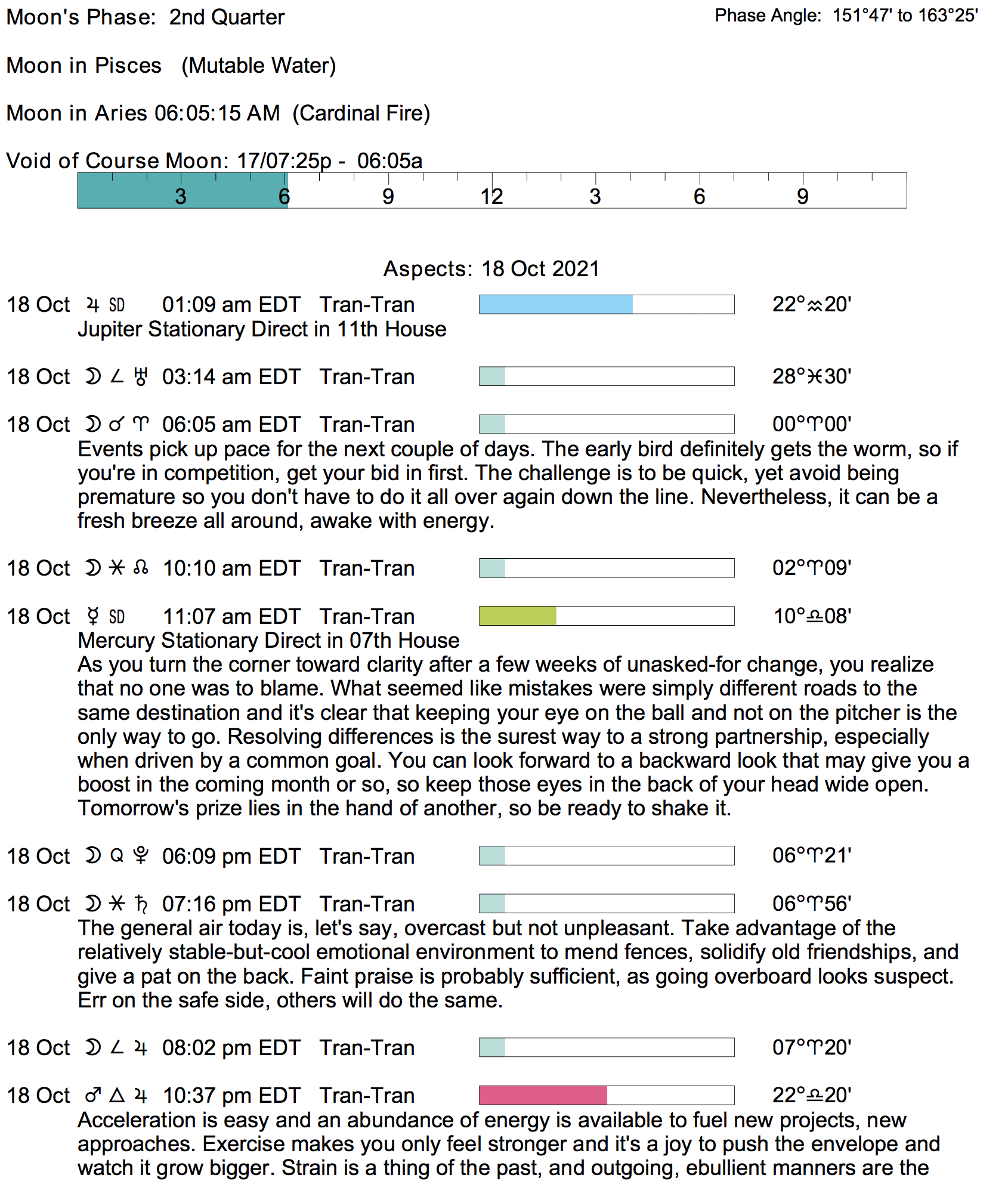 Planet Color Key: The longer the bar, the slower the aspecting planet, and the longer the duration of the planet’s transit.