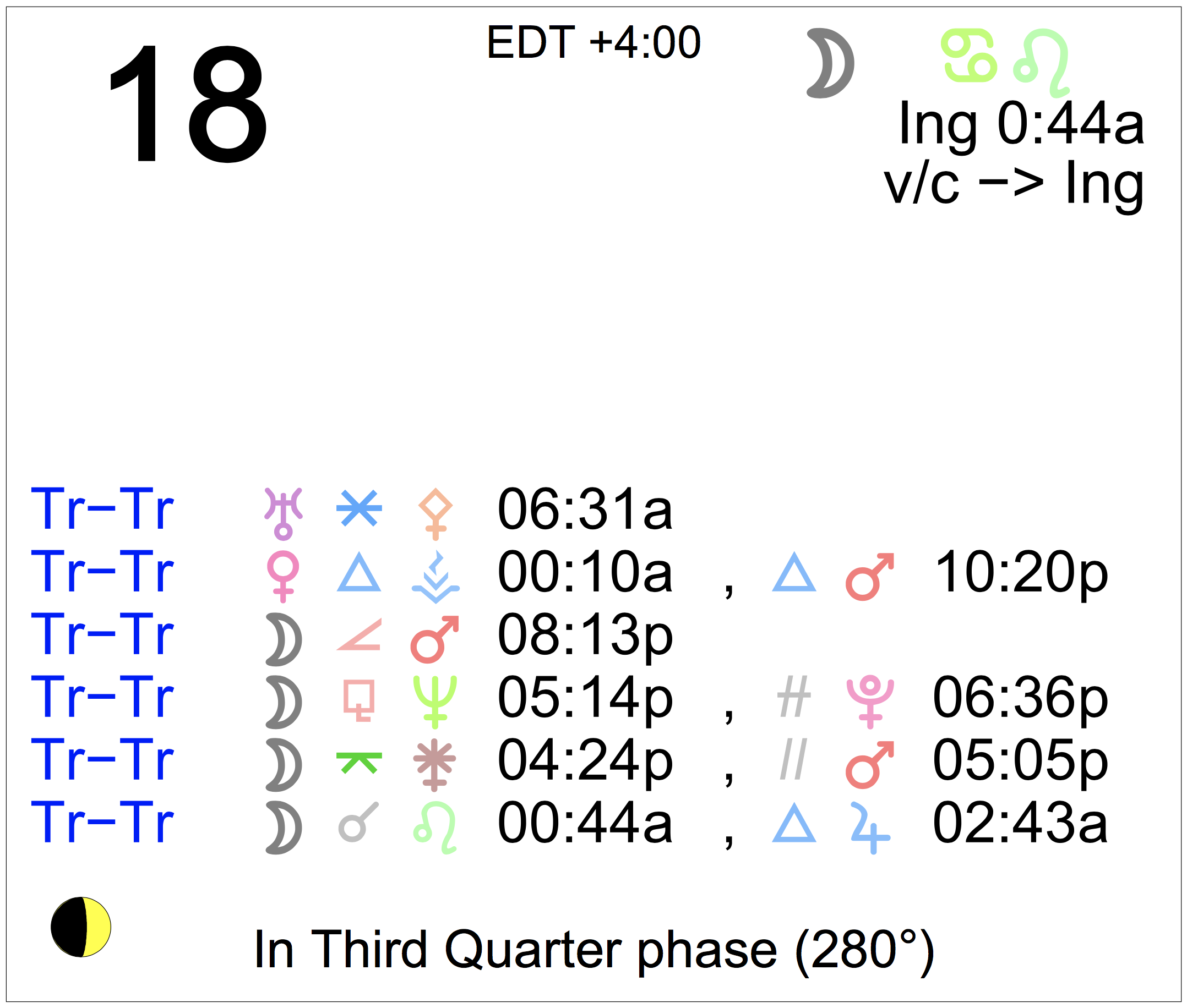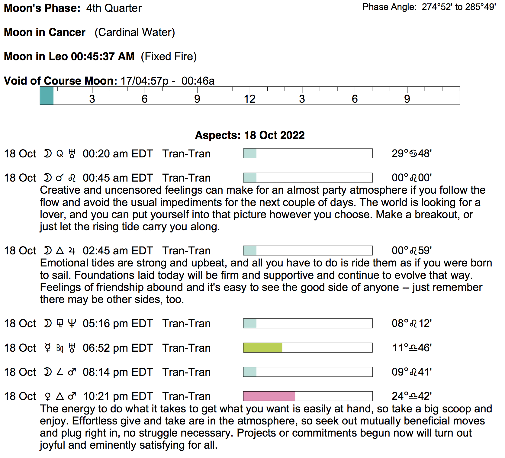 Planet Color Key: The longer the bar, the slower the aspecting planet, and the longer the duration of the planet’s transit.