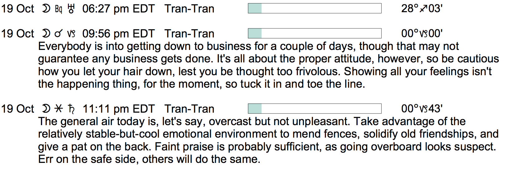 Planet Color Key: The longer the bar, the slower the aspecting planet, and the longer the duration of the planet’s transit.