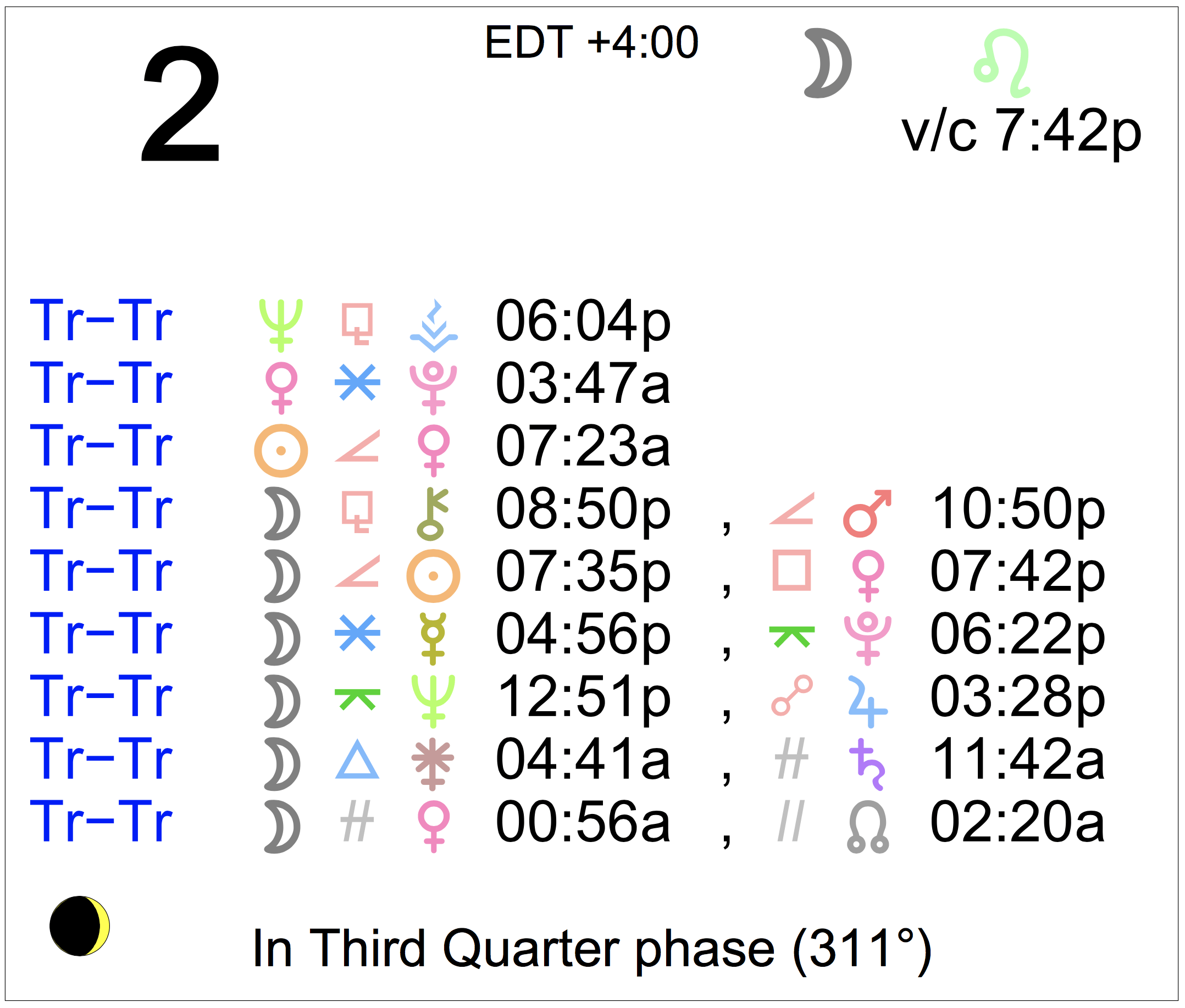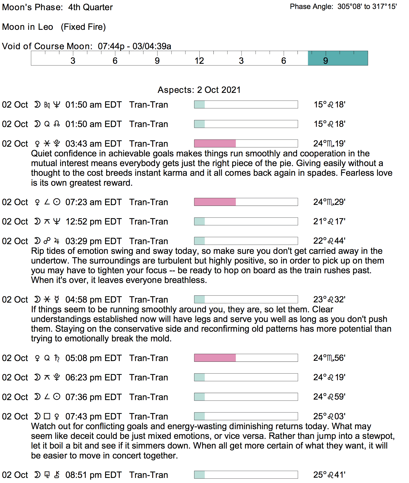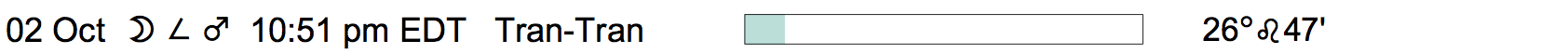 Planet Color Key: The longer the bar, the slower the aspecting planet, and the longer the duration of the planet’s transit.