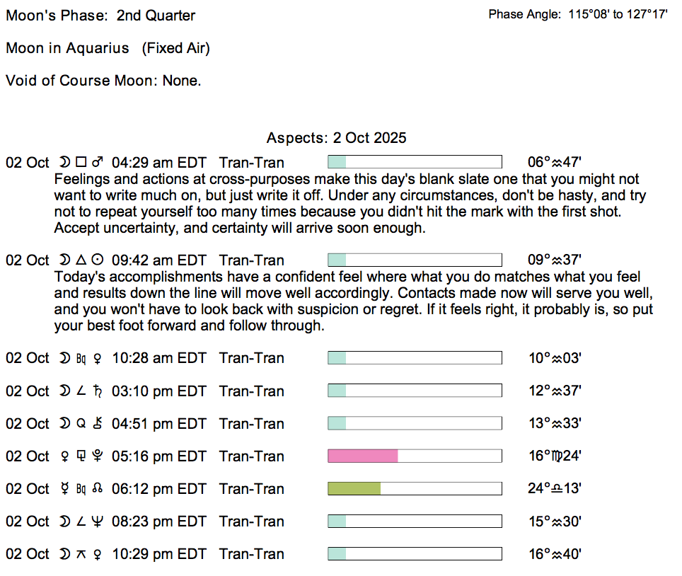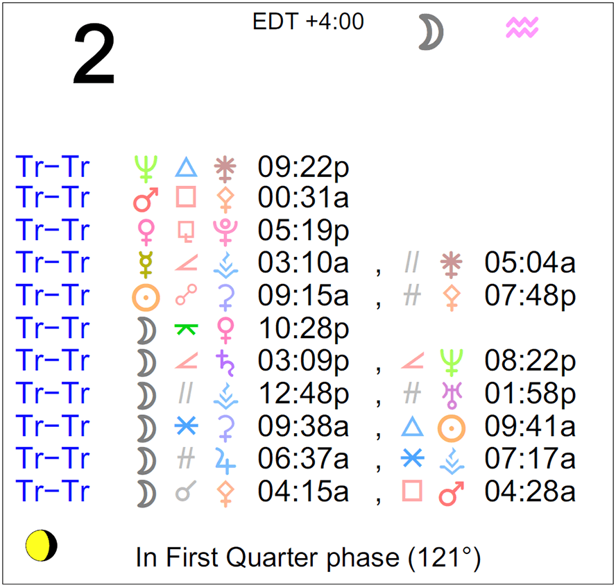 Planet Color Key: The longer the bar, the slower the aspecting planet, and the longer the duration of the planet’s transit.