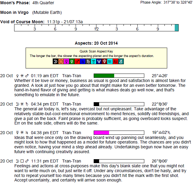 Note that the Moon moves at a rate of approximately one degree every 2 hours, so that if an aspect involving is applying and has an orb of 5 degrees, the aspect will perfect (be exact) in about 10 hours. If the Moon is separating from an aspect with an orb of 2 degrees, it has already formed said aspect approximately 4 hours ago (since the following are positions at noon today, then it would have occurred at about 8 AM today).