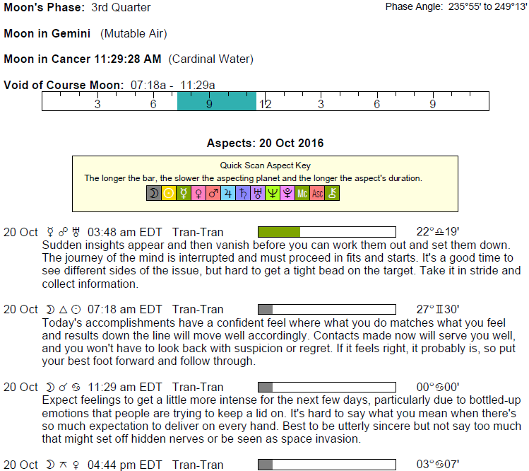 Note that the Moon moves at a rate of approximately one degree every 2 hours, so that if an aspect involving is applying and has an orb of 5 degrees, the aspect will perfect (be exact) in about 10 hours. If the Moon is separating from an aspect with an orb of 2 degrees, it has already formed said aspect approximately 4 hours ago (since the following are positions at noon today, then it would have occurred at about 8 AM today).