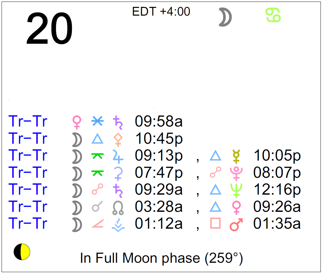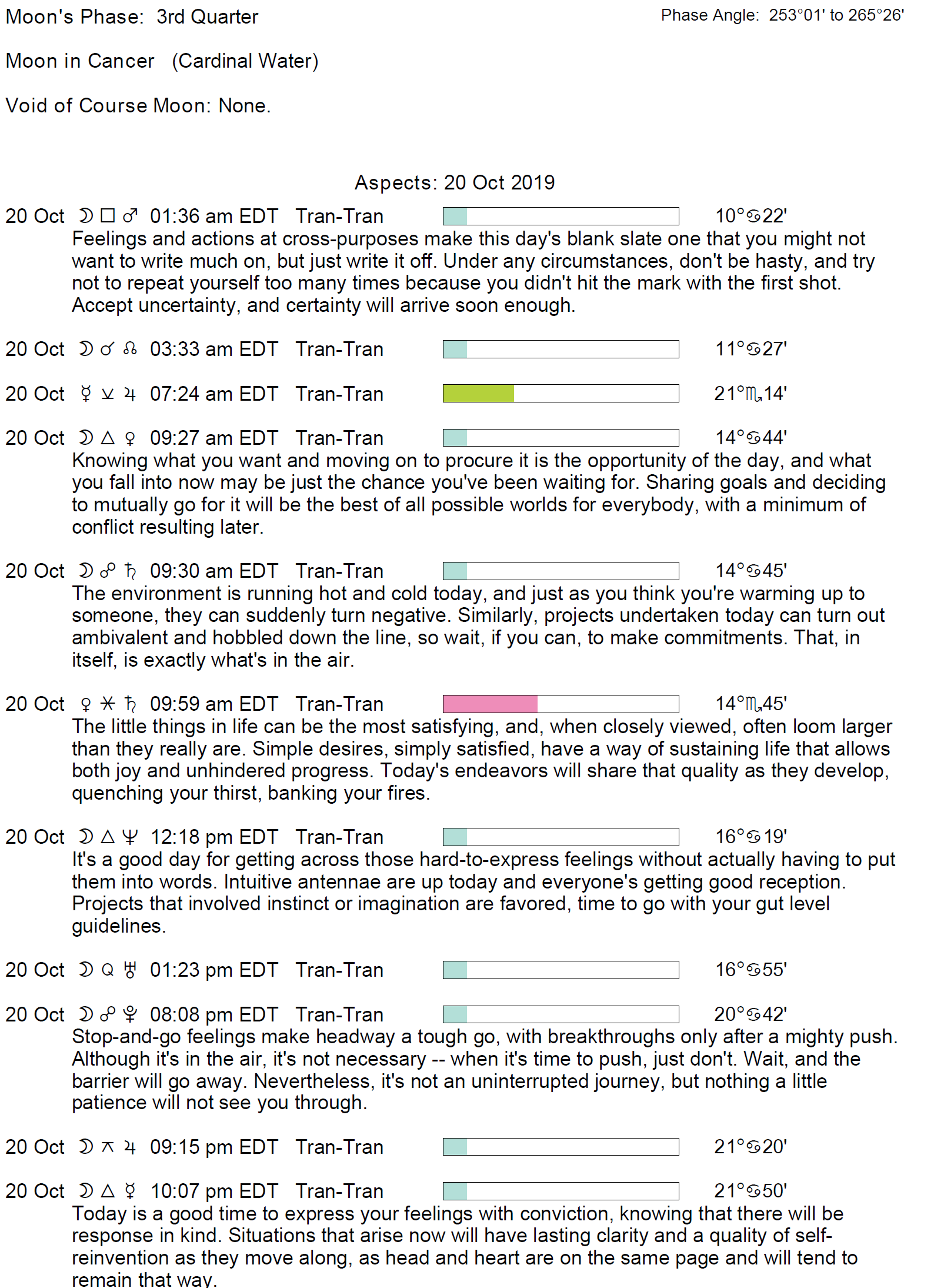 Planet Color Key: The longer the bar, the slower the aspecting planet and the longer the duration of the planet’s transit.