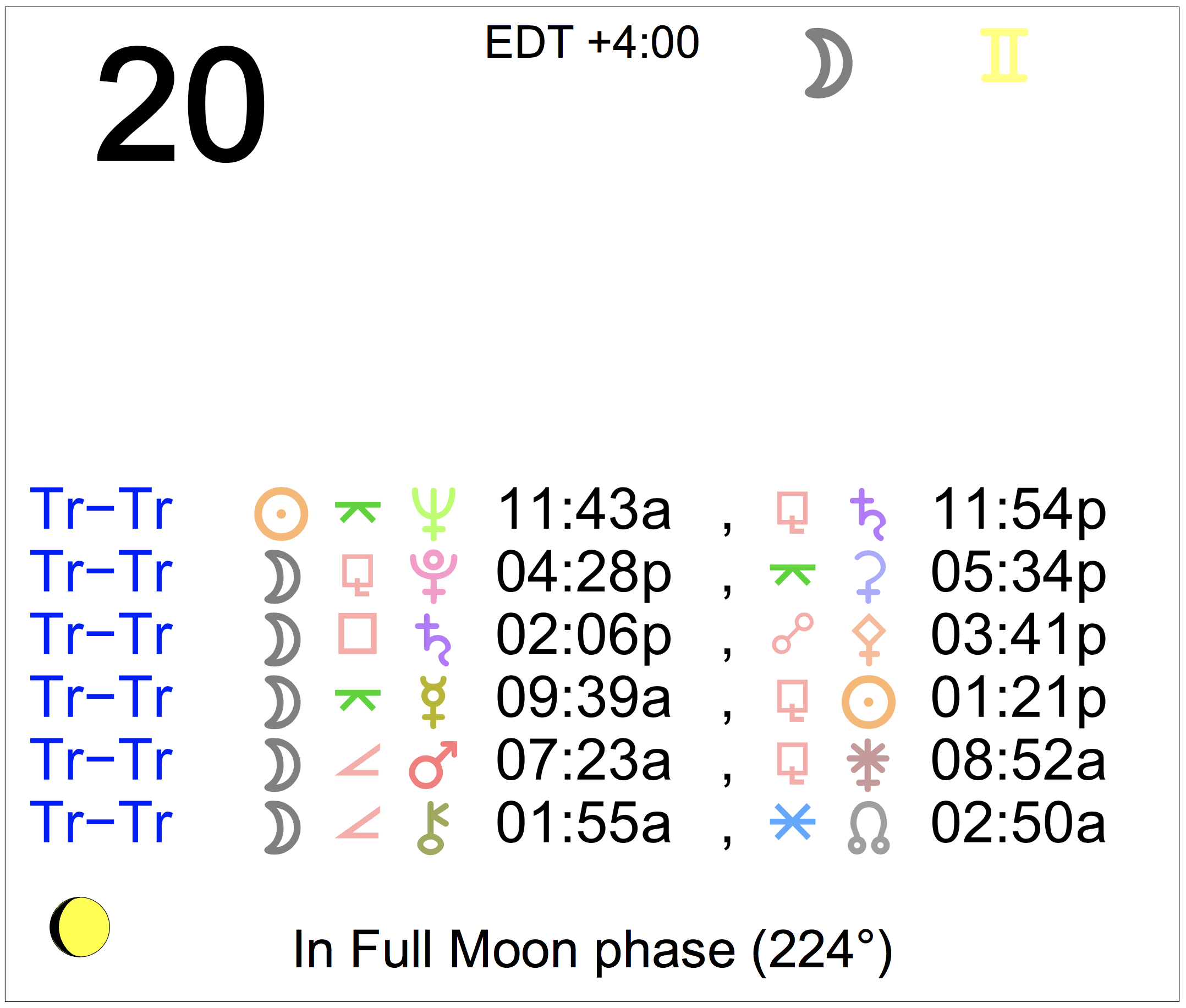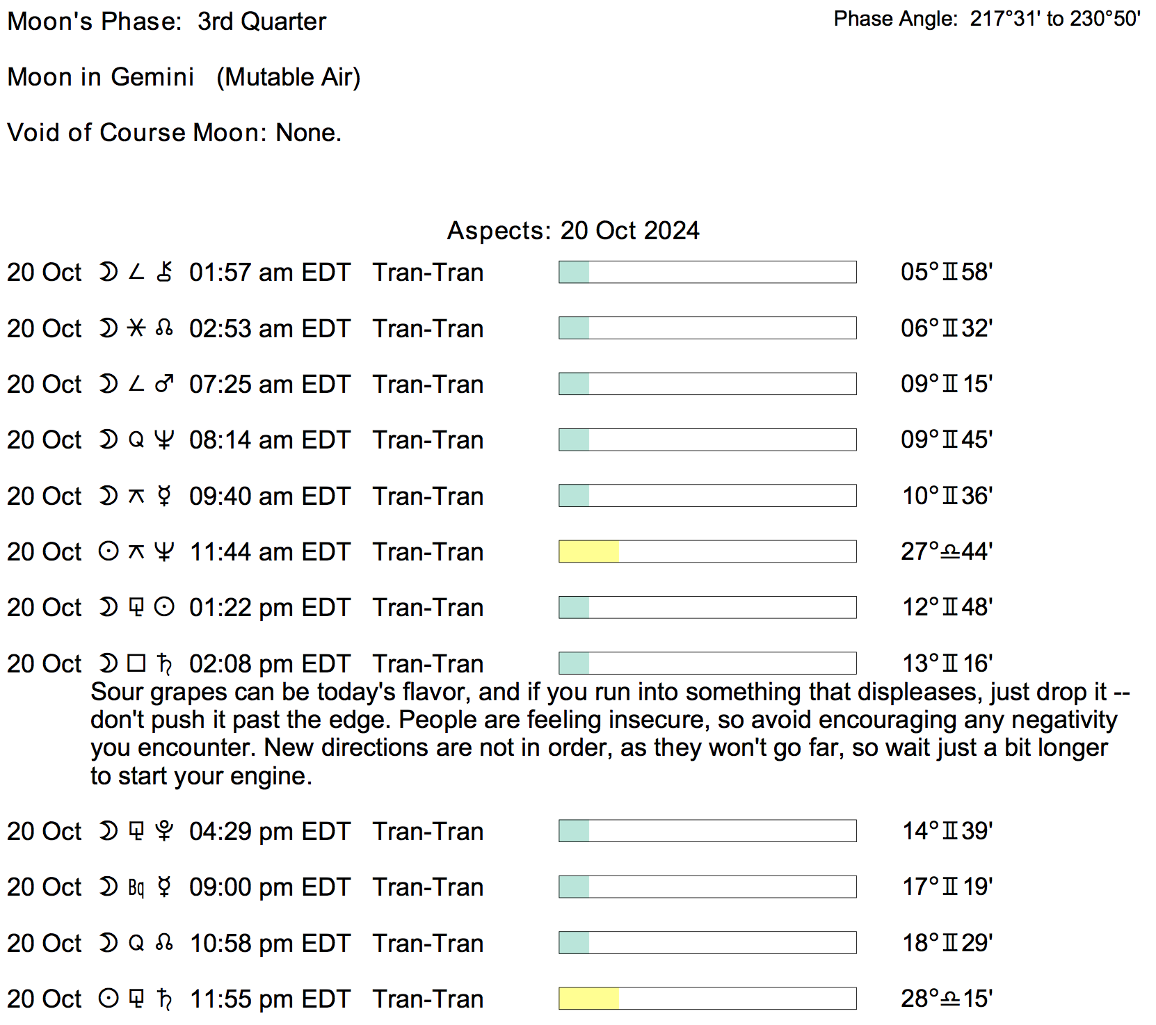 Planet Color Key: The longer the bar, the slower the aspecting planet, and the longer the duration of the planet’s transit.