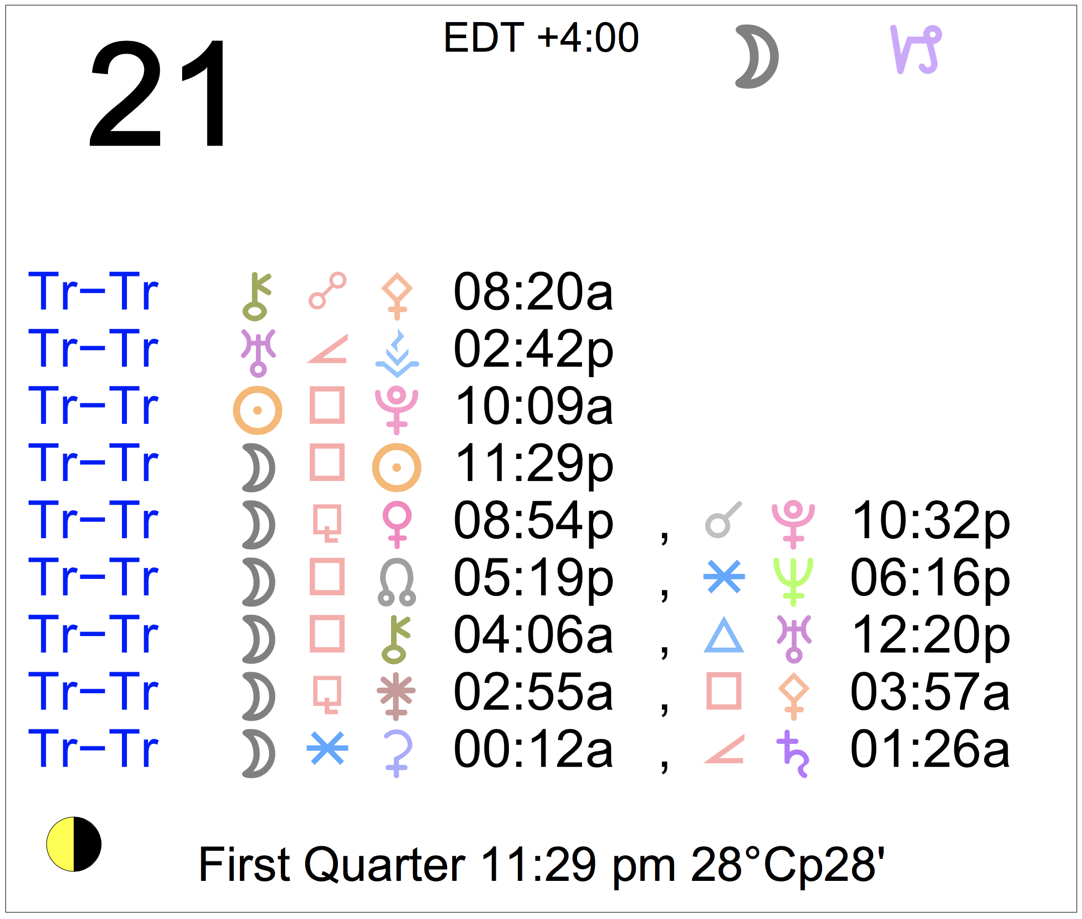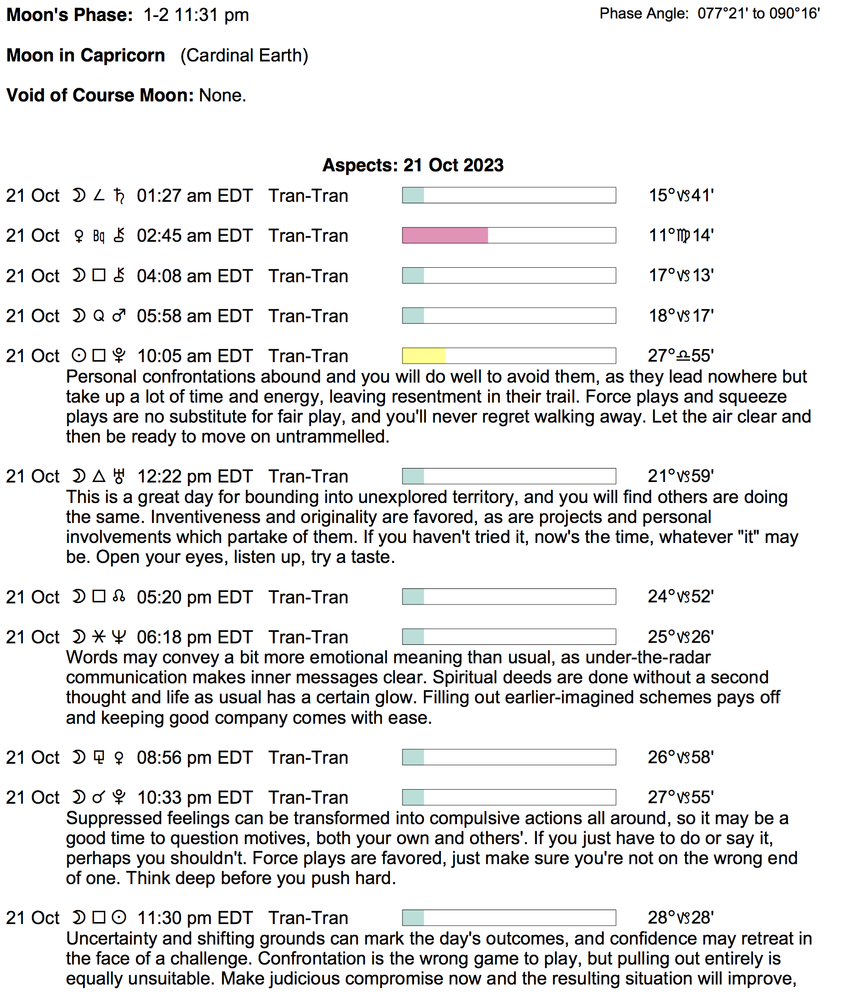 Planet Color Key: The longer the bar, the slower the aspecting planet, and the longer the duration of the planet’s transit.