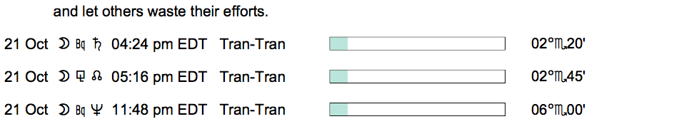 Planet Color Key: The longer the bar, the slower the aspecting planet, and the longer the duration of the planet’s transit.