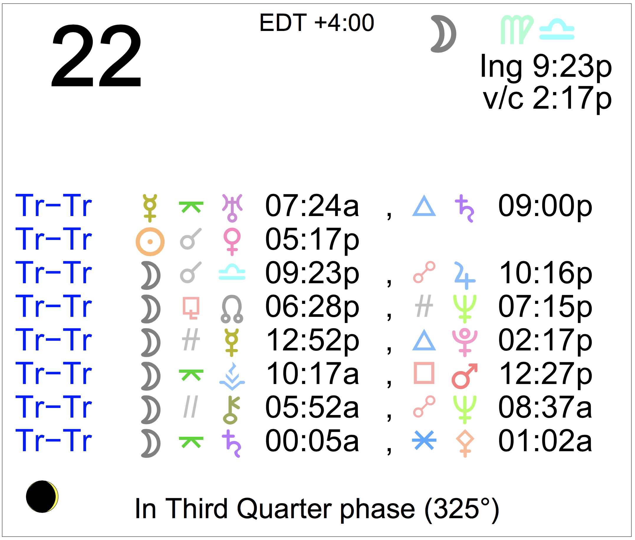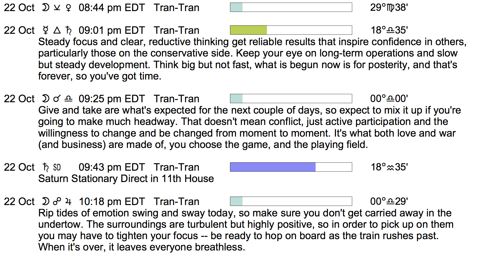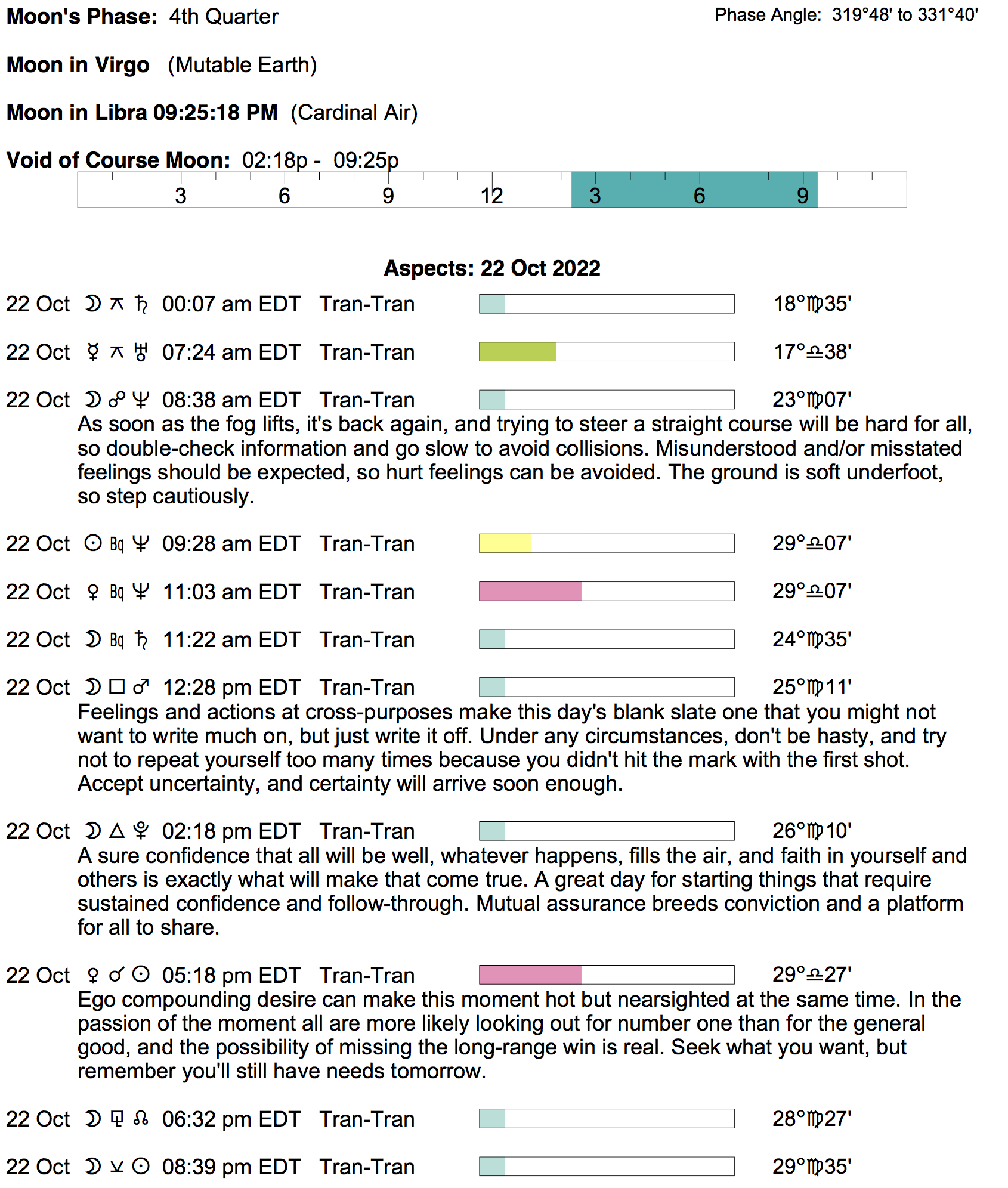 Planet Color Key: The longer the bar, the slower the aspecting planet, and the longer the duration of the planet’s transit.