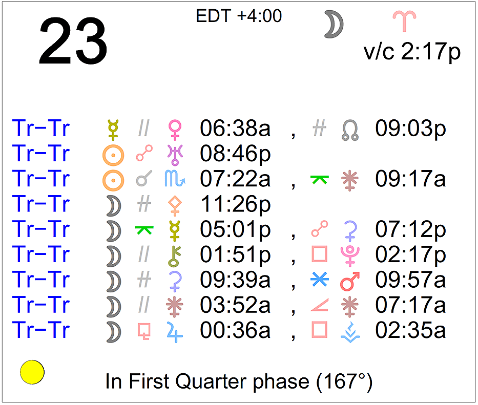 - We are in between the First Quarter Moon (which occurred on the 16th) and the Full Moon (which will happen in the sign of Taurus tomorrow).