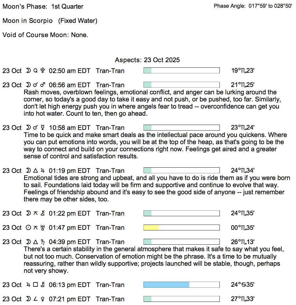 Planet Color Key: The longer the bar, the slower the aspecting planet, and the longer the duration of the planet’s transit.