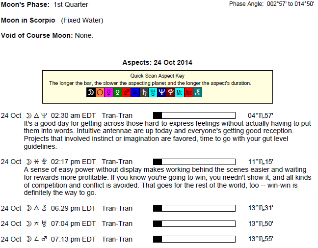 The following aspects (major only) and positions are at noon (EDT) on October 24th: