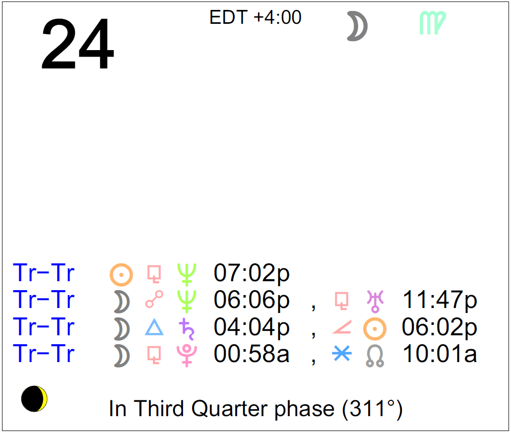 Planet Color Key: The longer the bar, the slower the aspecting planet and the longer the duration of the planet’s transit.
