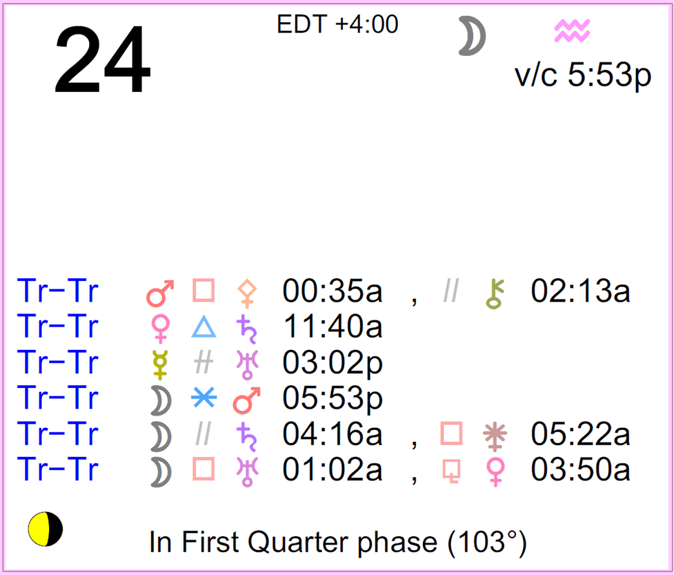 Planet Color Key: The longer the bar, the slower the aspecting planet, and the longer the duration of the planet’s transit.