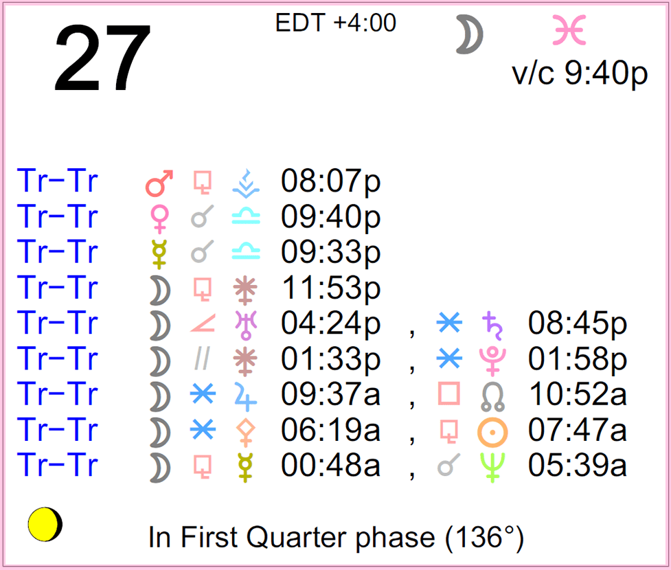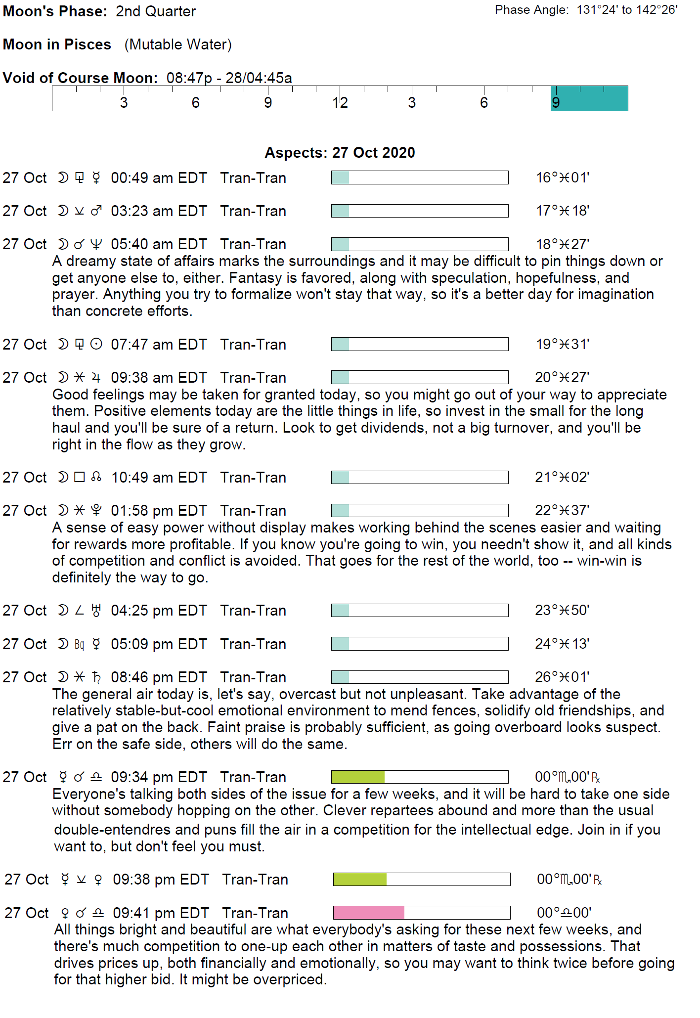 Planet Color Key: The longer the bar, the slower the aspecting planet, and the longer the duration of the planet’s transit.