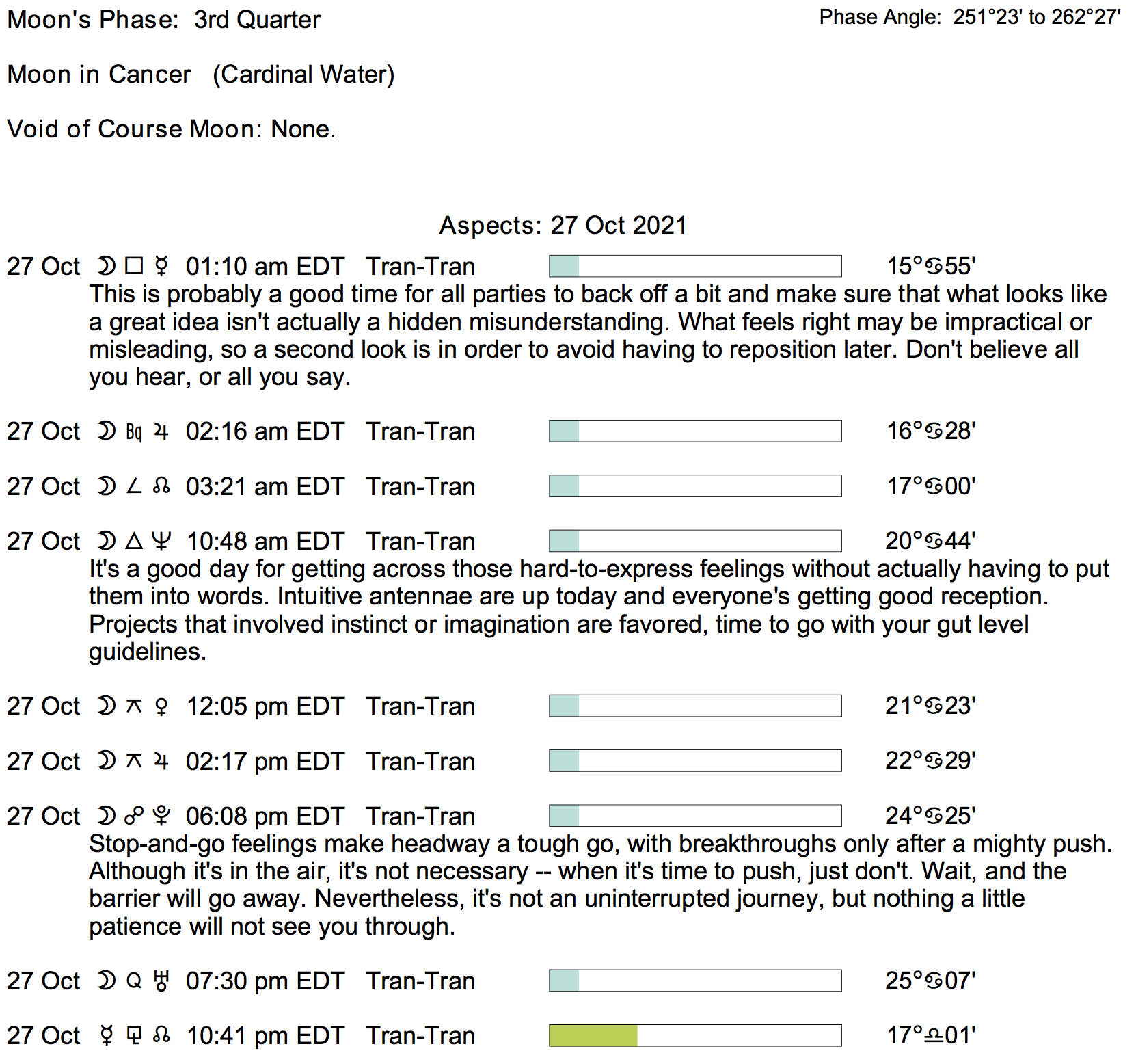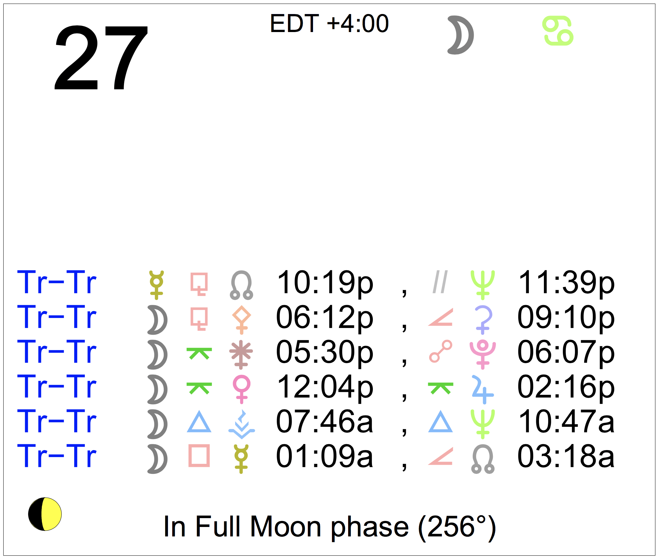 Planet Color Key: The longer the bar, the slower the aspecting planet, and the longer the duration of the planet’s transit.