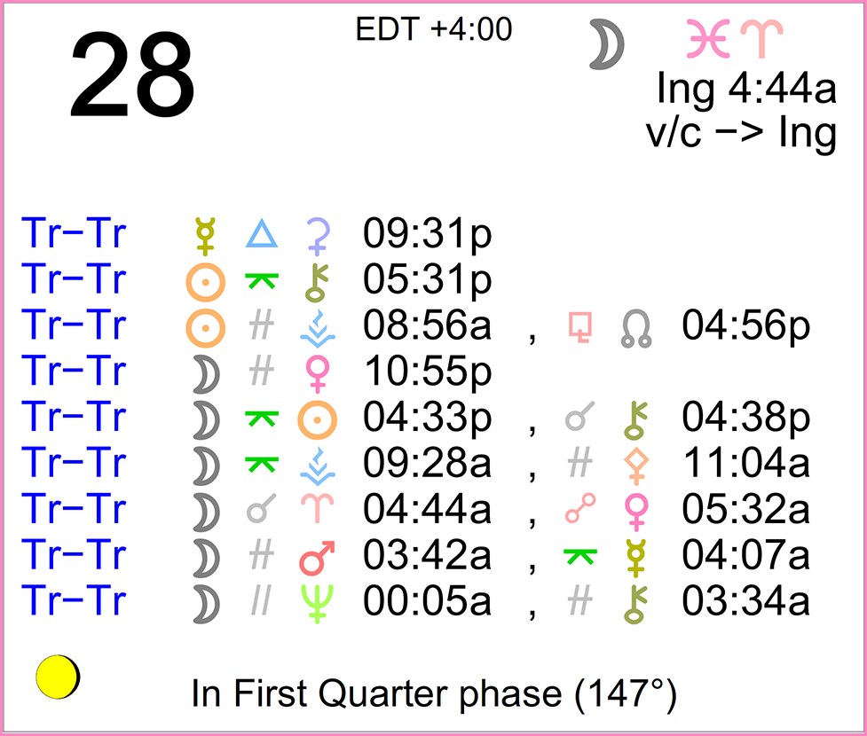 - The Moon is in Pisces until 4:44 AM, after which the Moon is in Aries.
