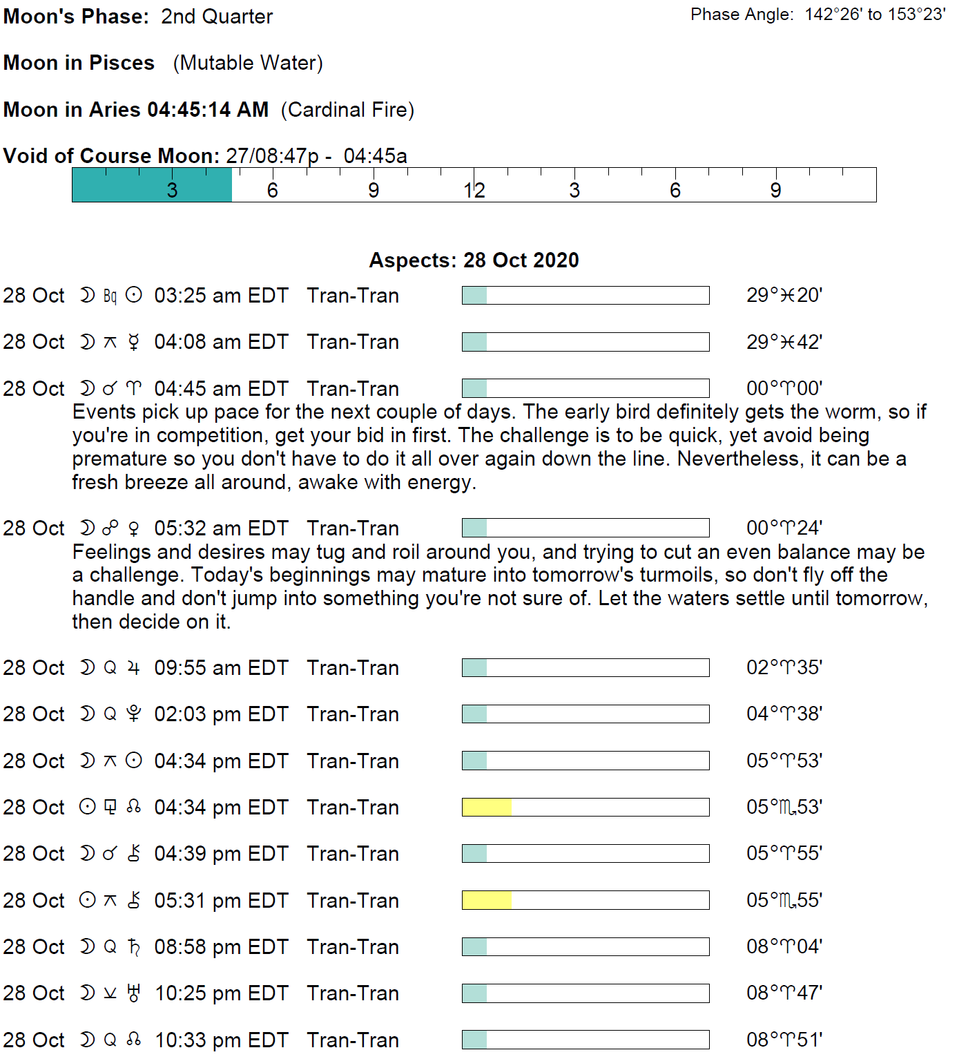 Planet Color Key: The longer the bar, the slower the aspecting planet, and the longer the duration of the planet’s transit.