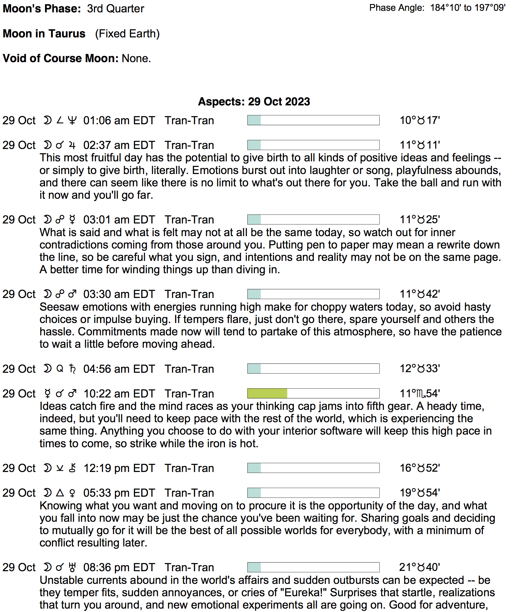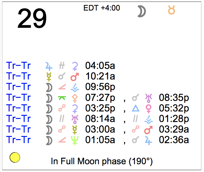 Planet Color Key: The longer the bar, the slower the aspecting planet, and the longer the duration of the planet’s transit.