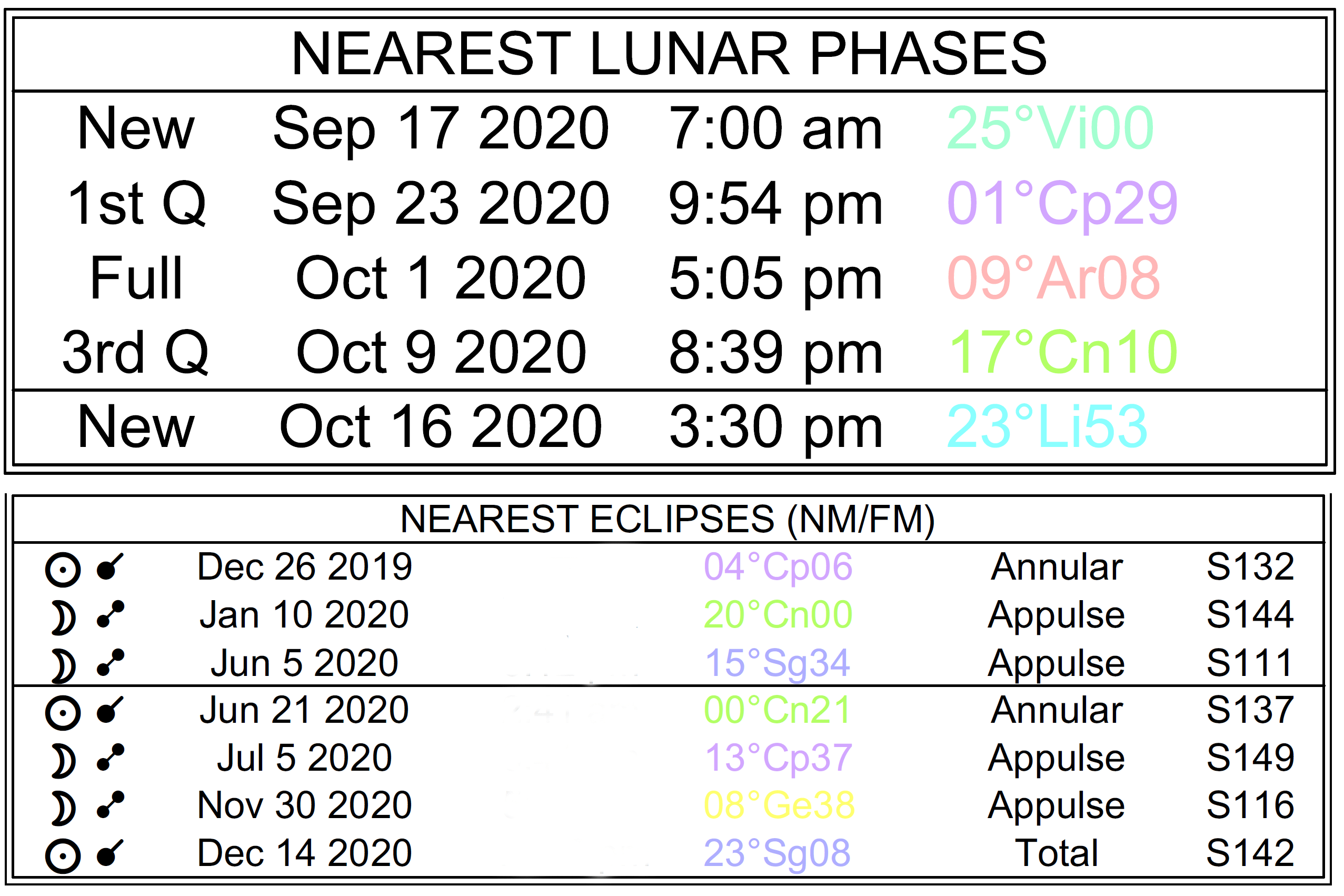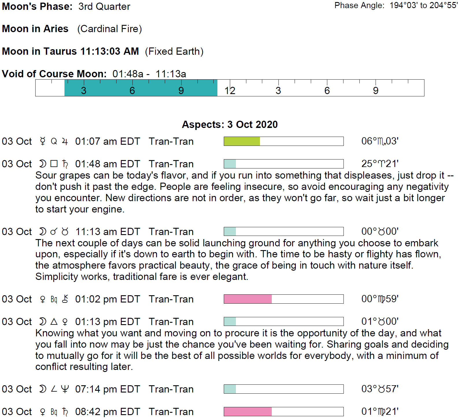 Planet Color Key: The longer the bar, the slower the aspecting planet and the longer the duration of the planet’s transit.