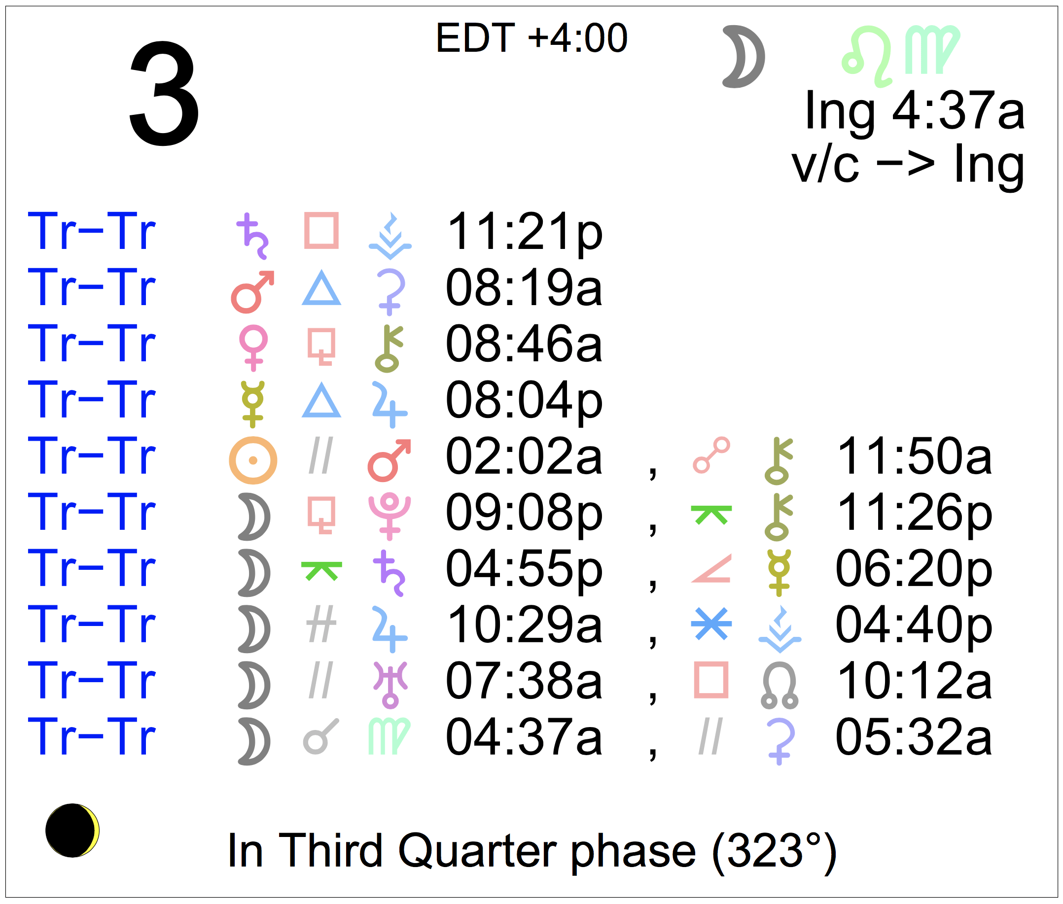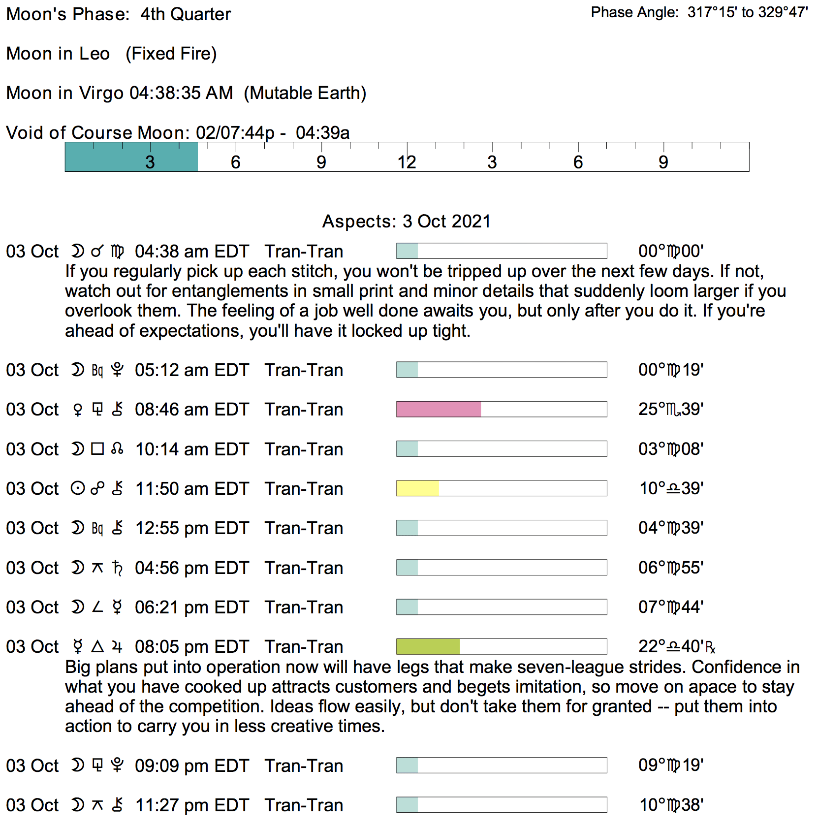 Planet Color Key: The longer the bar, the slower the aspecting planet, and the longer the duration of the planet’s transit.